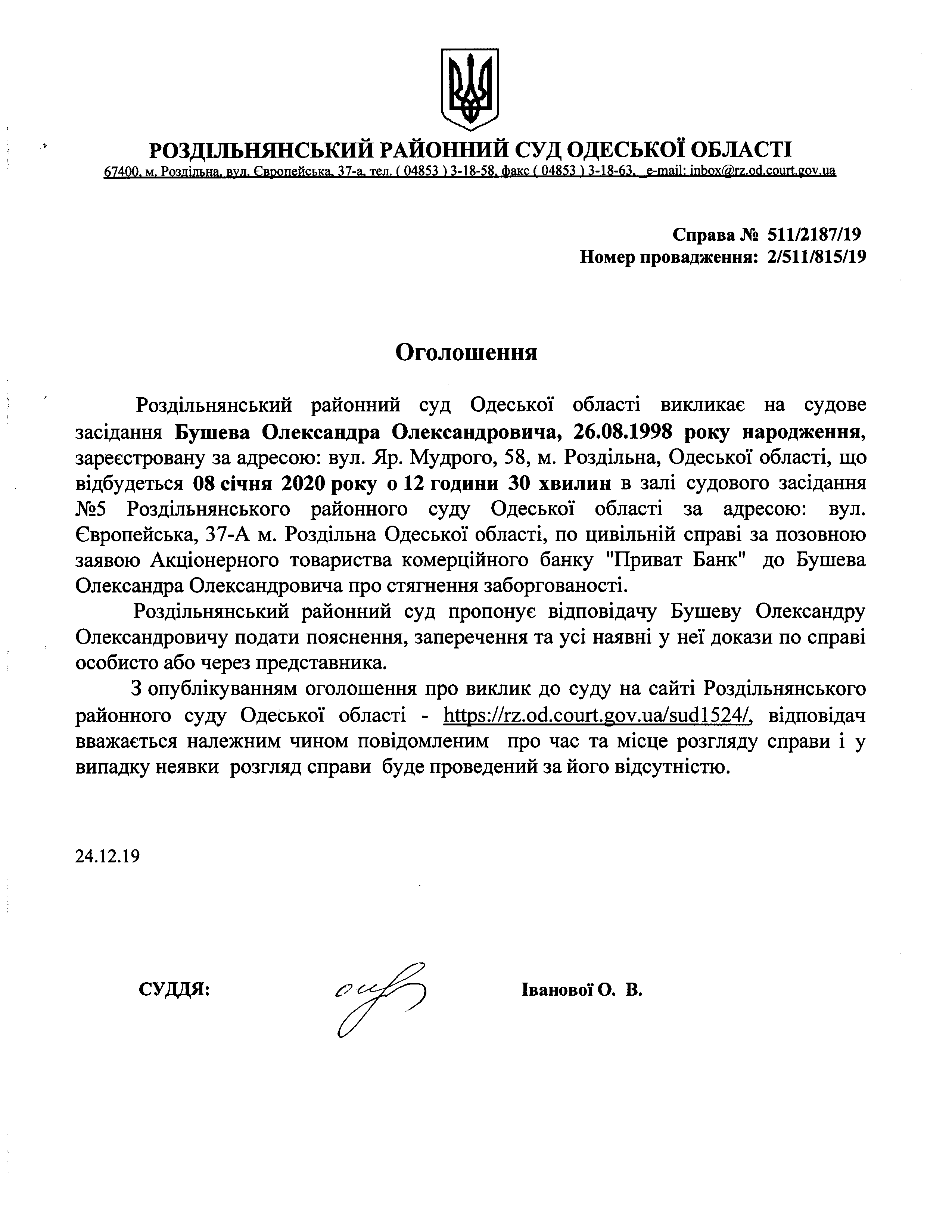 Оголошення про виклик до суду Бушева Олександра Олександровича
