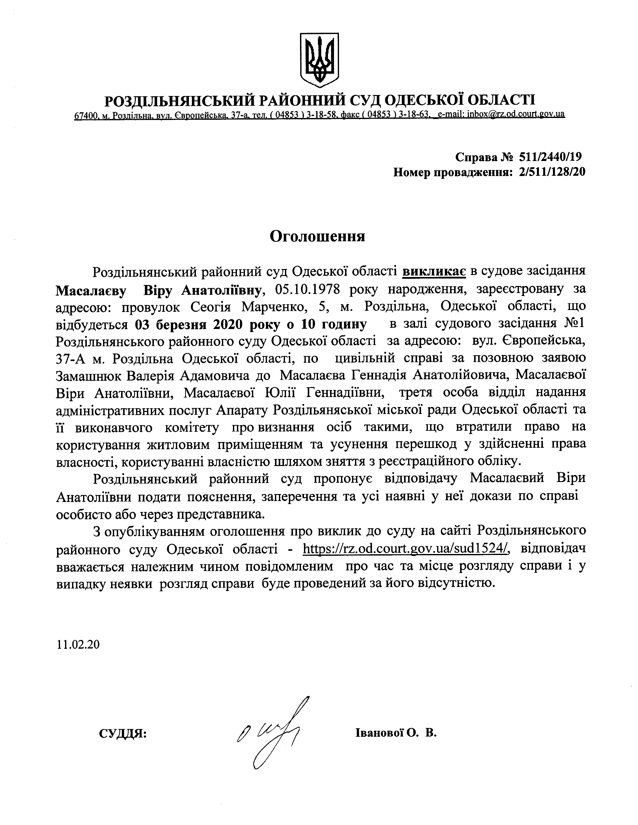 Оголошення про виклик до суду Масалаєву Віру Анатоліївну