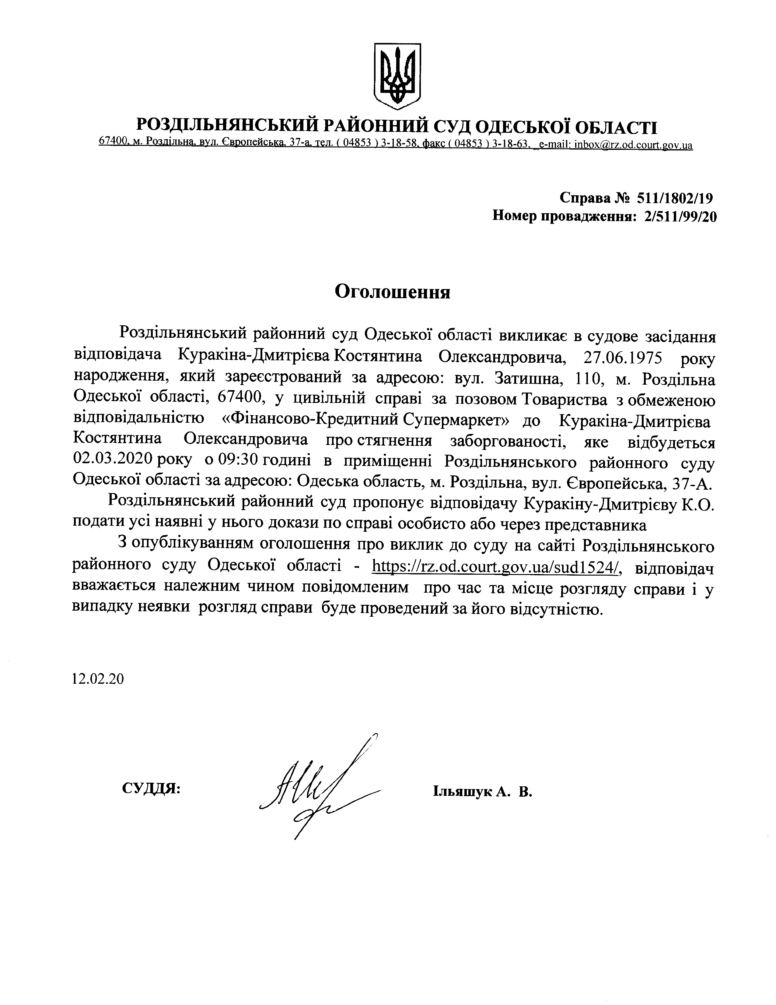 Оголошення про виклик до суду Куракіна-Дмитрієва Костянтина Олександровича