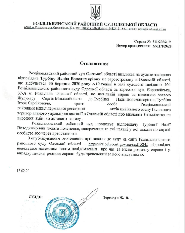 Оголошення про виклик до суду Турбіну Надію Володимирівну