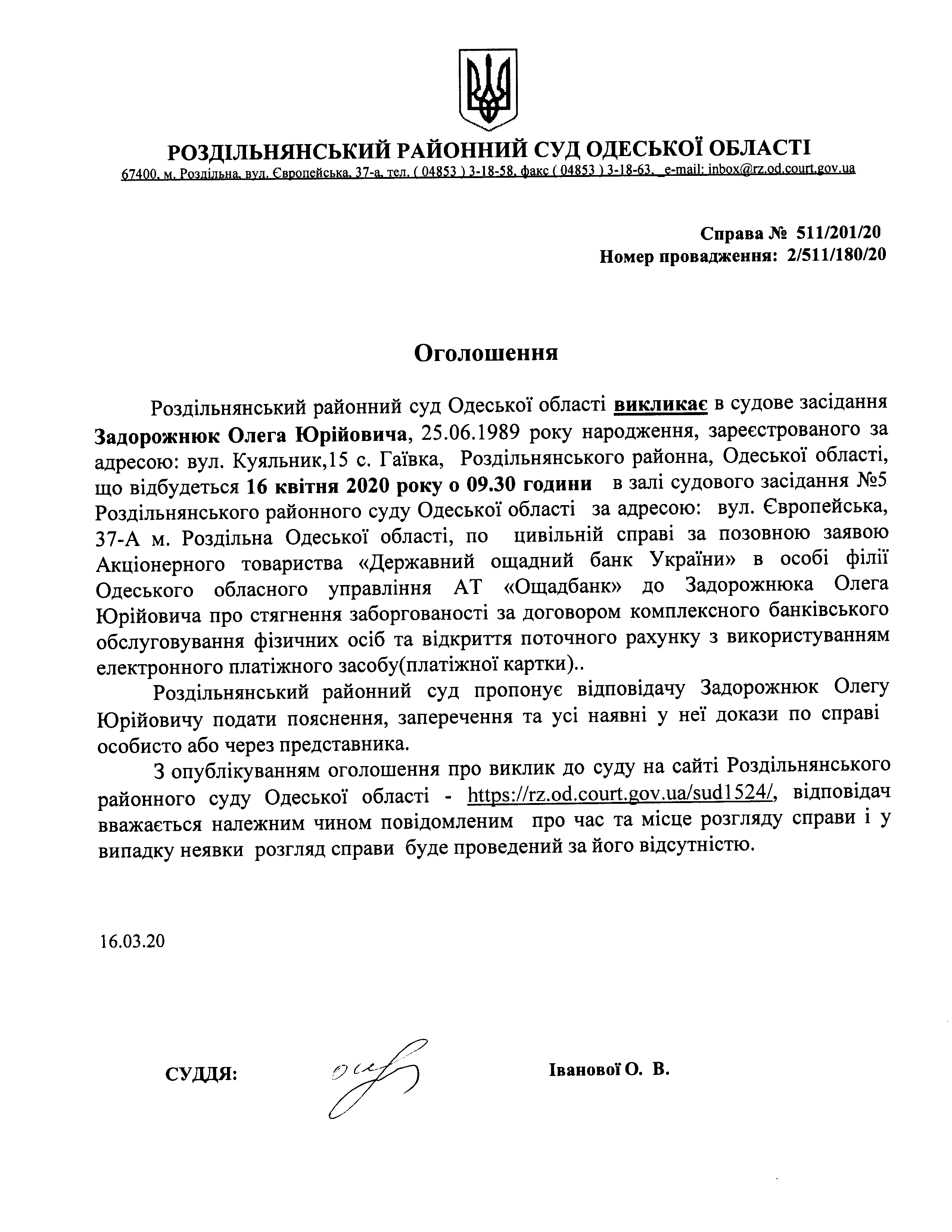 Оголошення про виклик до суду Задорожнюк Олега Юрійовича