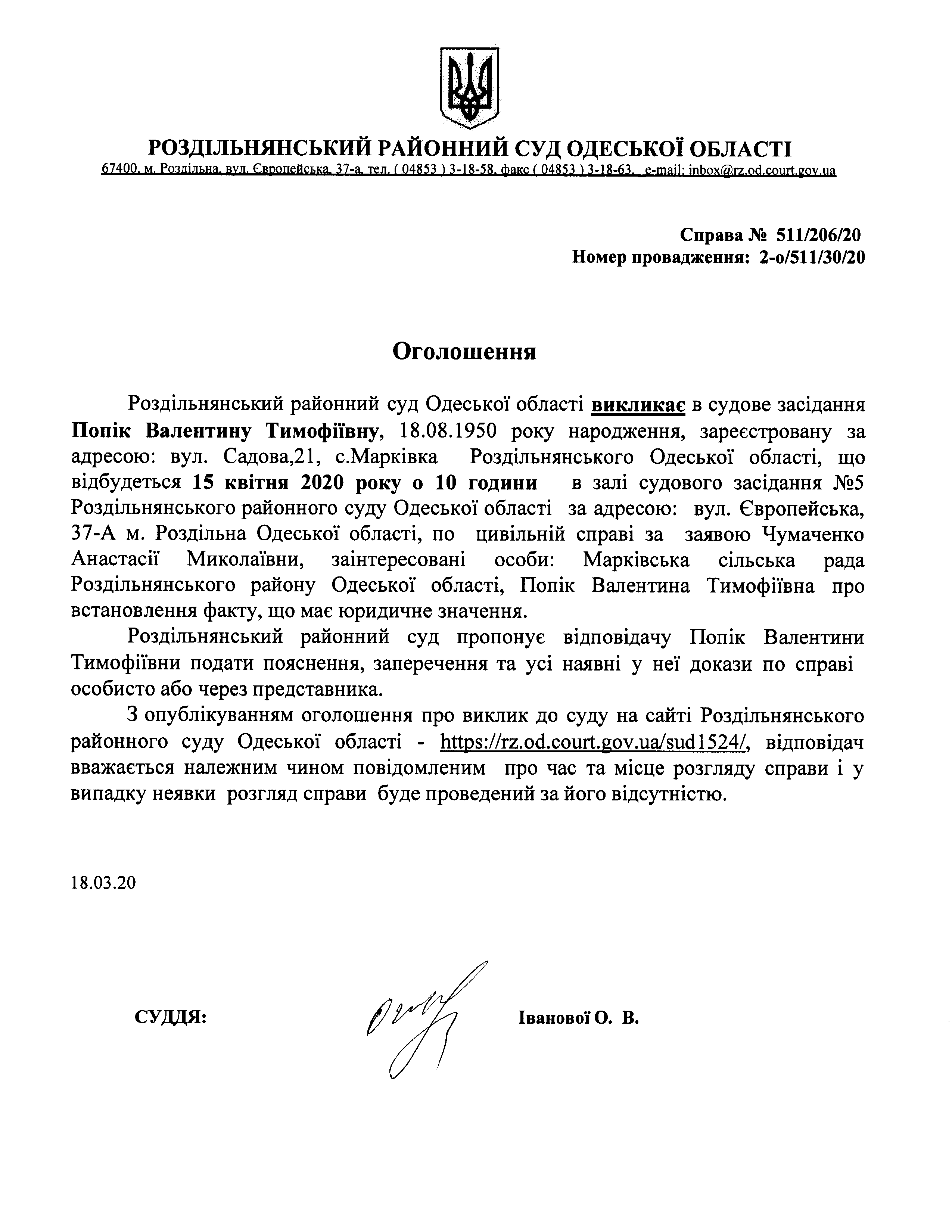 Оголошення про виклик до суду Попік Валентину Тимофіївну