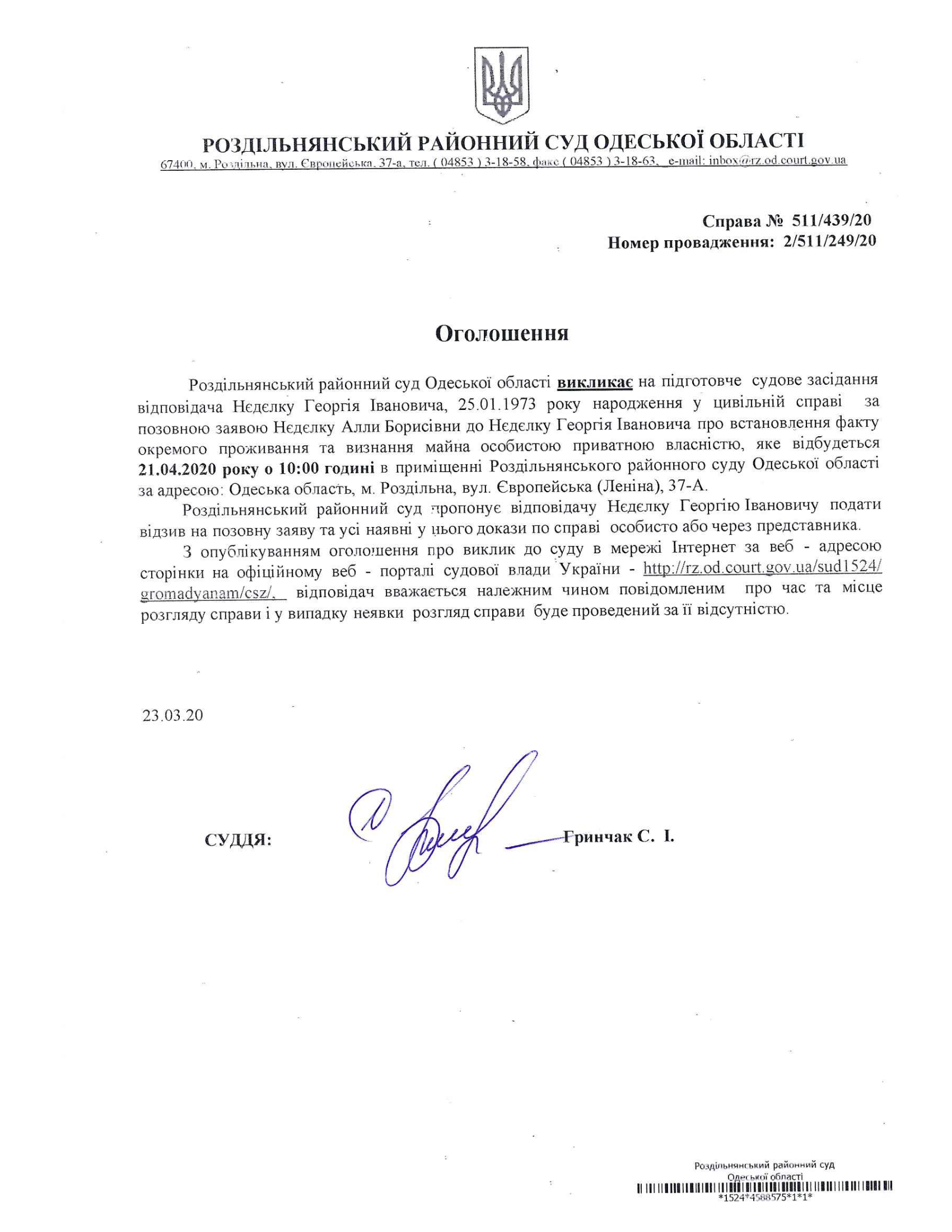 Оголошення про виклик до суду Нєдєлку Георгія Івановича