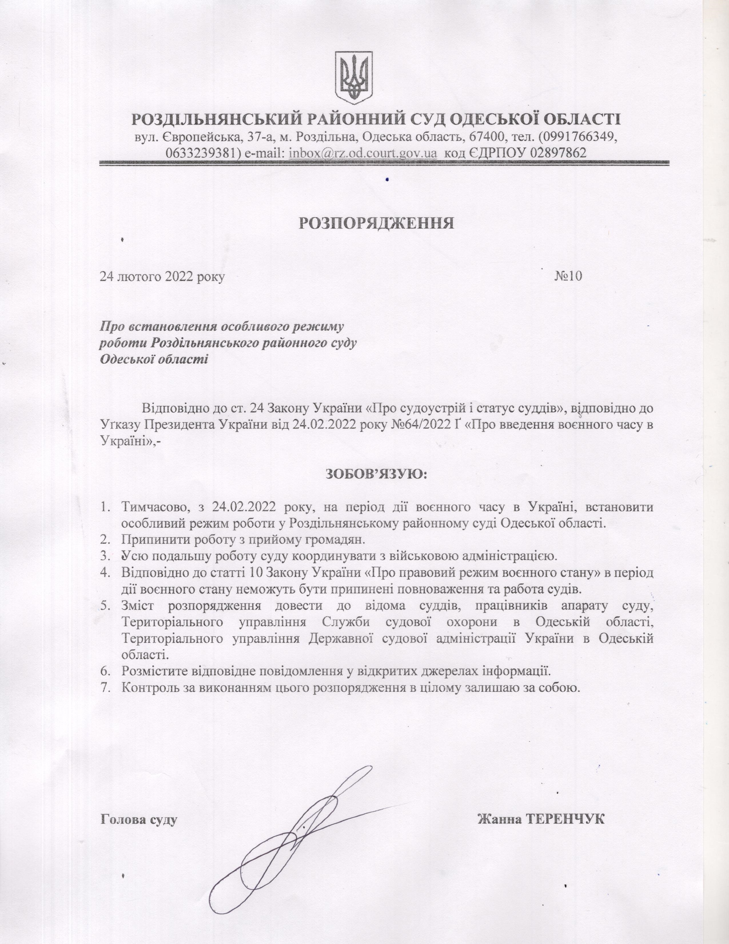 У зв’язку із запровадженням на території України воєнного стану просимо утриматися від відвідування суду.