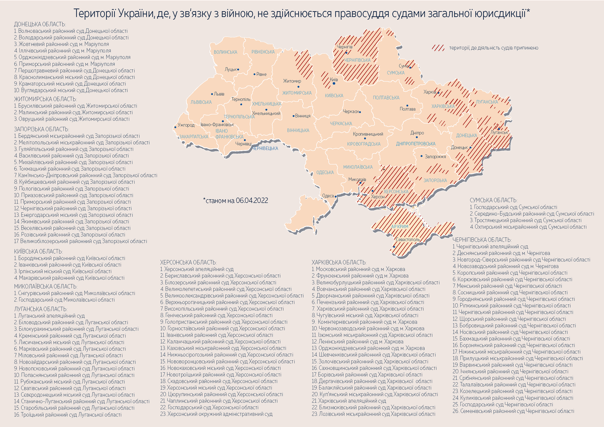 У Верховному Суді оновили карту територій України, де у зв’язку з війною не здійснюється правосуддя судами загальної юрисдикції. . Інформація станом на 06 квітня 2022 року.
