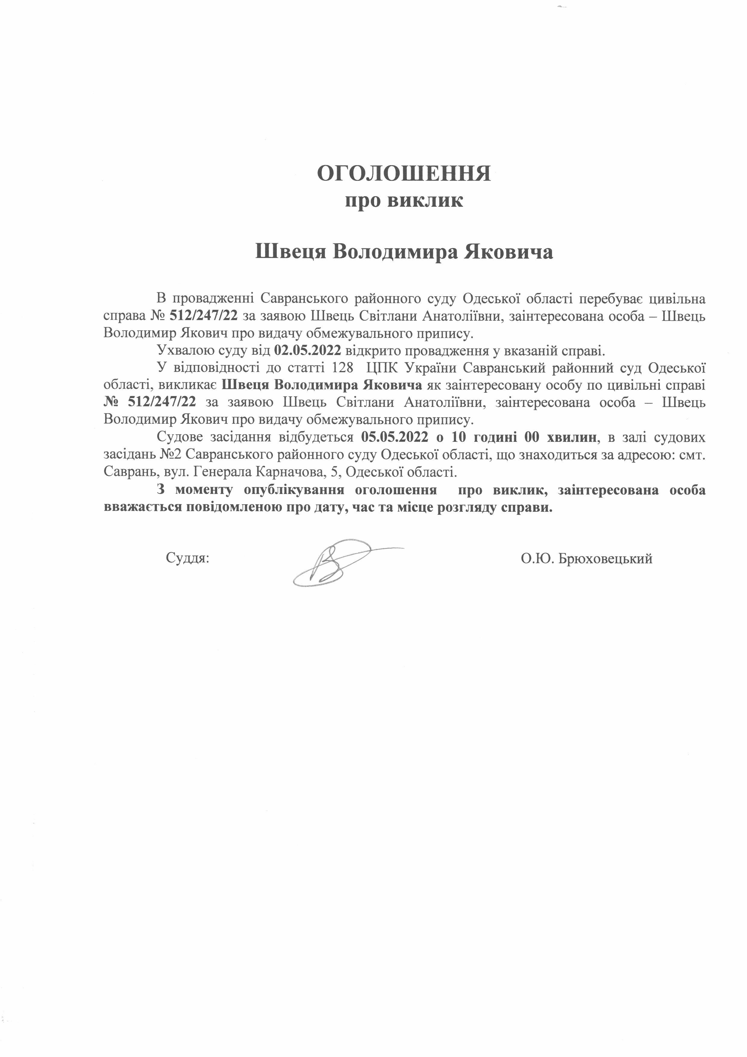 Оголошення про виклик до суду відповідача у цивільній справі №512/247/22 Щвеця Володимира Яковича