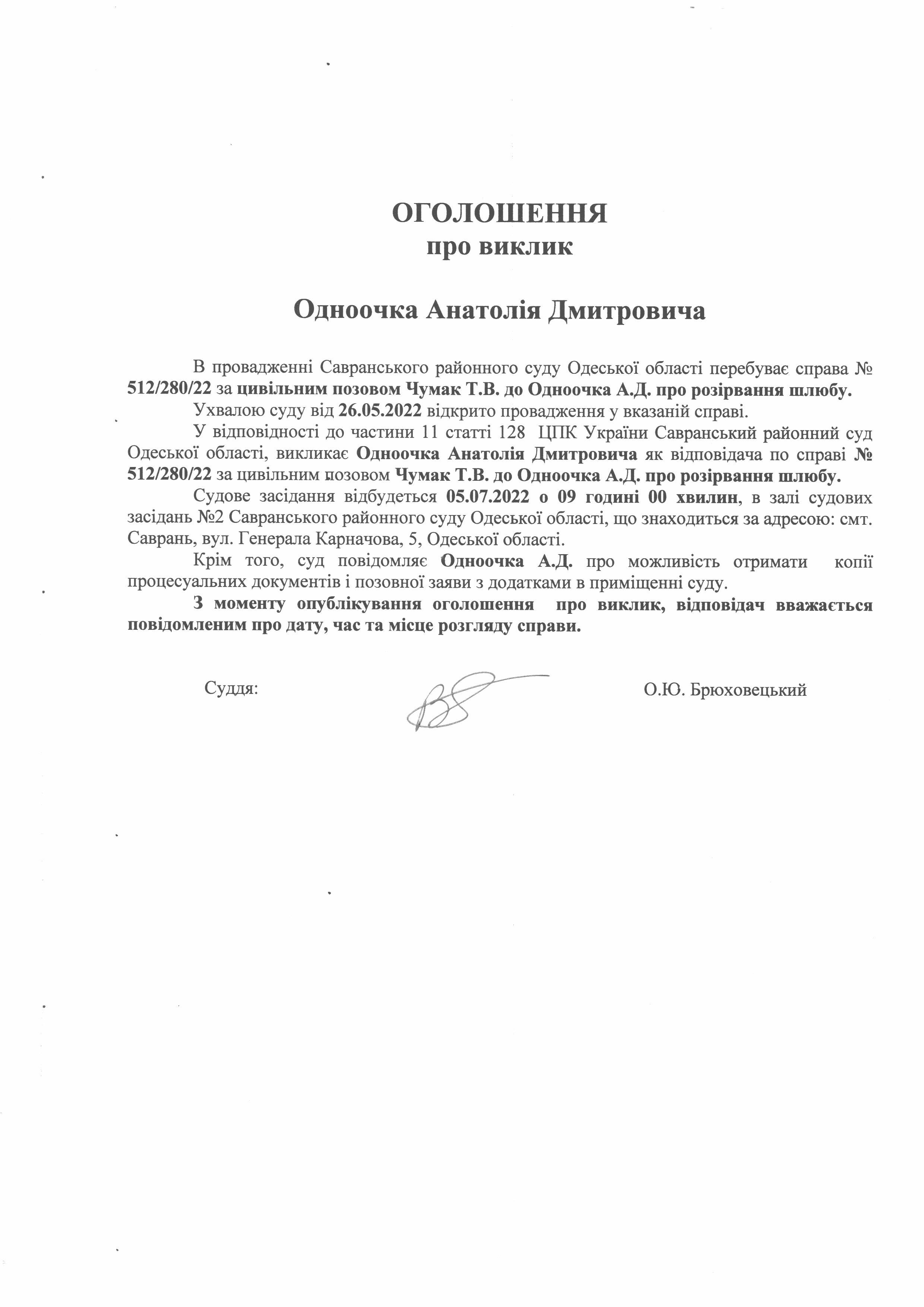 Оголошення про виклик до суду відповідача у цивільній справі №512/280/22 Одноочка Анатолія Дмитровича