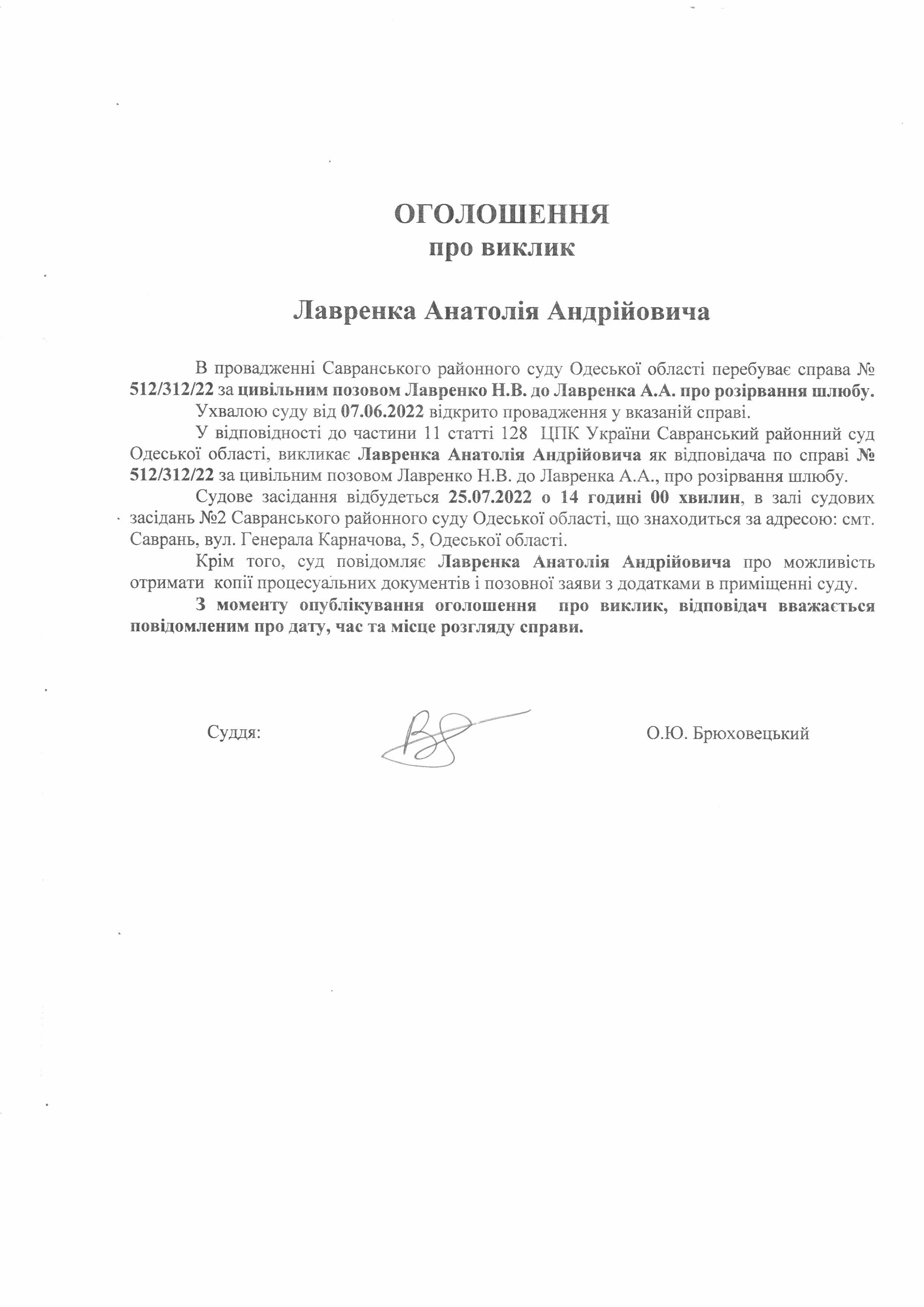 Оголошення про виклик до суду відповідача у цивільній справі №512/312/22 Лавренка Анатолія Андрійовича
