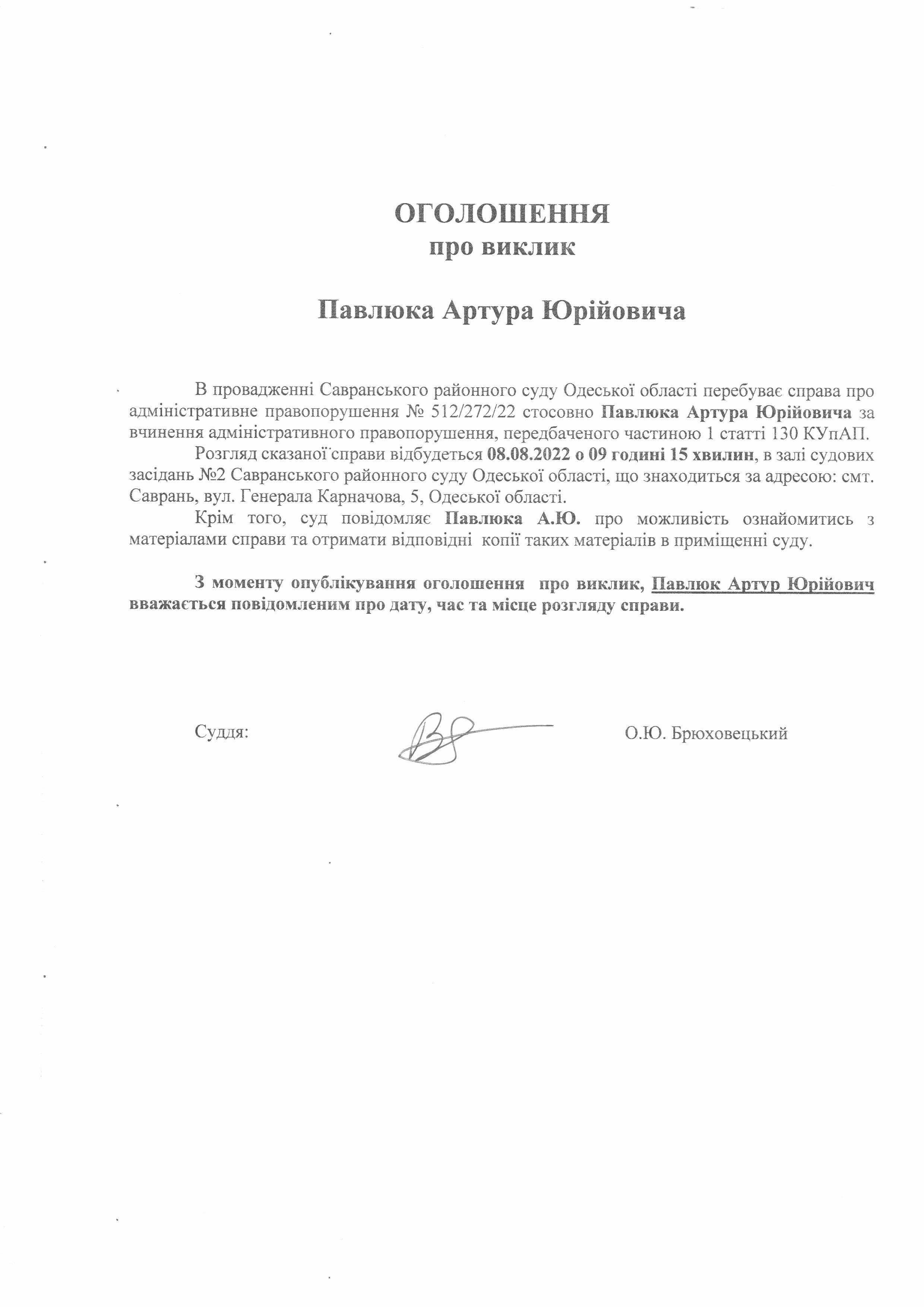 Оголошення про виклик до суду відповідача у цивільній справі №512/272/22 Павлюка Артура Юрійовича