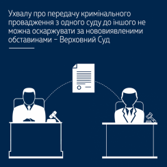 Про це йдеться в постанові колегії суддів Другої судової палати Касаційного кримінального суду у складі Верховного Суду, яка розглянула касаційну скаргу жінки на ухвалу апеляційного суду про відмову у відкритті провадження за її заявою про перегляд за нововиявленими обставинами іншої ухвали цього ж суду. Останнім судовим рішенням клопотання особи про направлення кримінального провадження за обвинуваченням її у вчиненні злочину, передбаченого ч. 3 ст. 185 Кримінального кодексу України (крадіжка), з одного місцевого суду на розгляд до іншого залишено без задоволення.