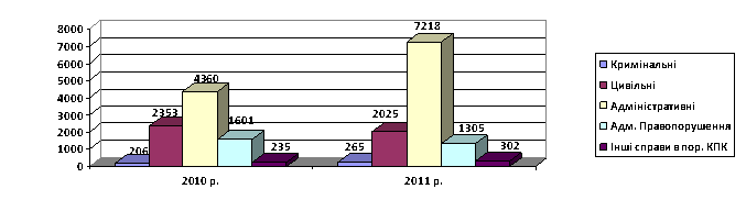 Слід зазначити, що під час розрахунку кількості закінчених справ до уваги бралися лише ті справи, що були прийняті до провадження суду, під час підрахунку закінчених справ про адміністративні провадження до уваги не бралися справи, що були повернуті для дооформлення. Таким чином, із приведеної таблиці та діаграми вбачається, що в звітному періоді збільшилася загальна кількість закінчених провадженням справ в порівнянні з 2010 роком. А саме по таких категоріях, як кримінальні справи – на 59 справ, справи адміністративного судочинства – на 3022, що в сукупному розрахунку збільшило кількість закінчених справ в 2011 році в порівнянні з 2010 роком більше, ніж на 30%.