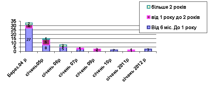Досліджуючи питання стану оперативності судочинства в частині розгляду цивільних справ, слід зазначити, що з часу об’єднання районного і міського судів в міськрайонний, тобто з березня 2004 року, кількість цивільних справ, що розглядалися з порушенням строків суттєво зменшувалася. Так , якщо станом на 01.07.2004 року в провадженні Миргородського міськрайонного суду знаходилося всього 150 цивільні справи, які перебували в провадженні суду понад 3 місяці і не були зупинені у встановленому законом порядку, то станом на 01.01.2005 року їх було вже 114, на 01.07.2005 року -76 справ, на 01.07.2006 року – 58 справ, на 01.01.2007 року – їх залишок становив вже 31 справа, на 01.01.2008 року – їх залишок становив 26 справ, на 01.01.2009 – 10 справ, на 01.01.2010 року – 13 справ, на 01.01.2011 – 9 справ, станом на 01.01.2012 – всього 2 справи.