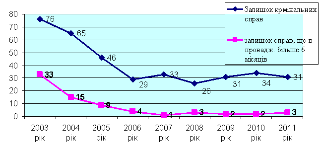 Крім цього, слід також зазначити, що з моменту об’єднання Миргородського районного і міськрайонного судів стабільно і стрімко щороку зменшувалася загальна кількість кримінальних справ, що залишалися в залишку на кінець кожного звітного періоду.