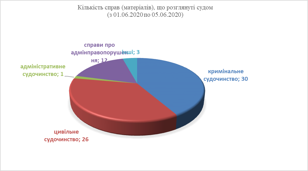 Так, у період з 01 червня 2020 року по 05 червня 2020 року до суду надійшло 98 справ (матеріалів) різних категорій.
