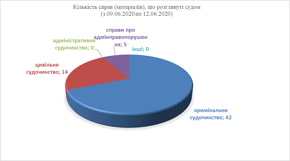 Так, у період з 09 червня 2020 року по 12 червня 2020 року до суду надійшло 67 справ (матеріалів) різних категорій.