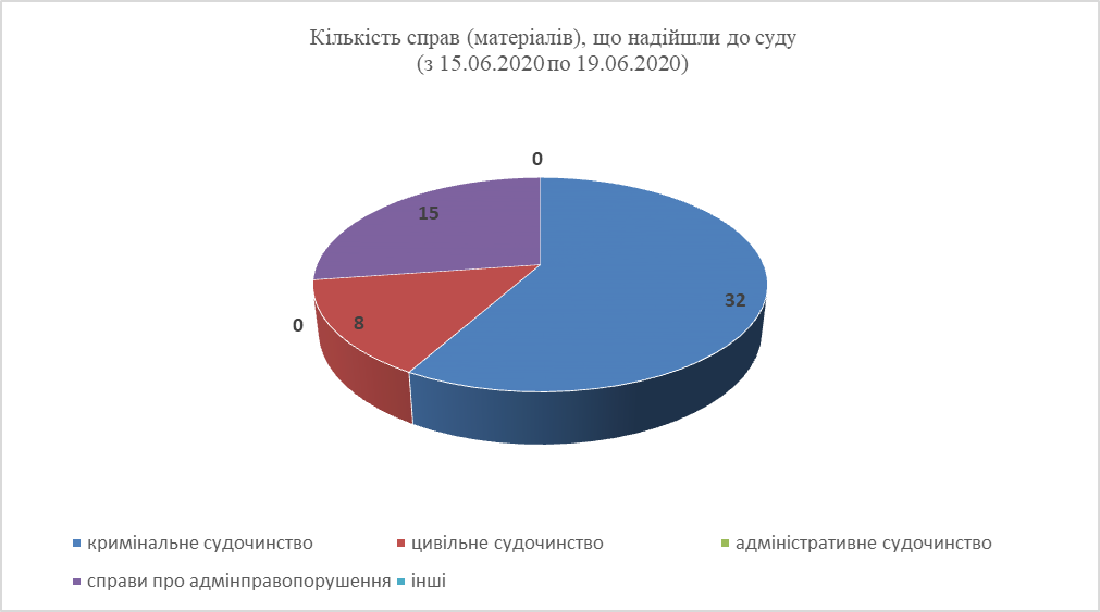 Так, у період з 15 червня 2020 року по 19 червня 2020 року до суду надійшло 55 справ (матеріалів) різних категорій.