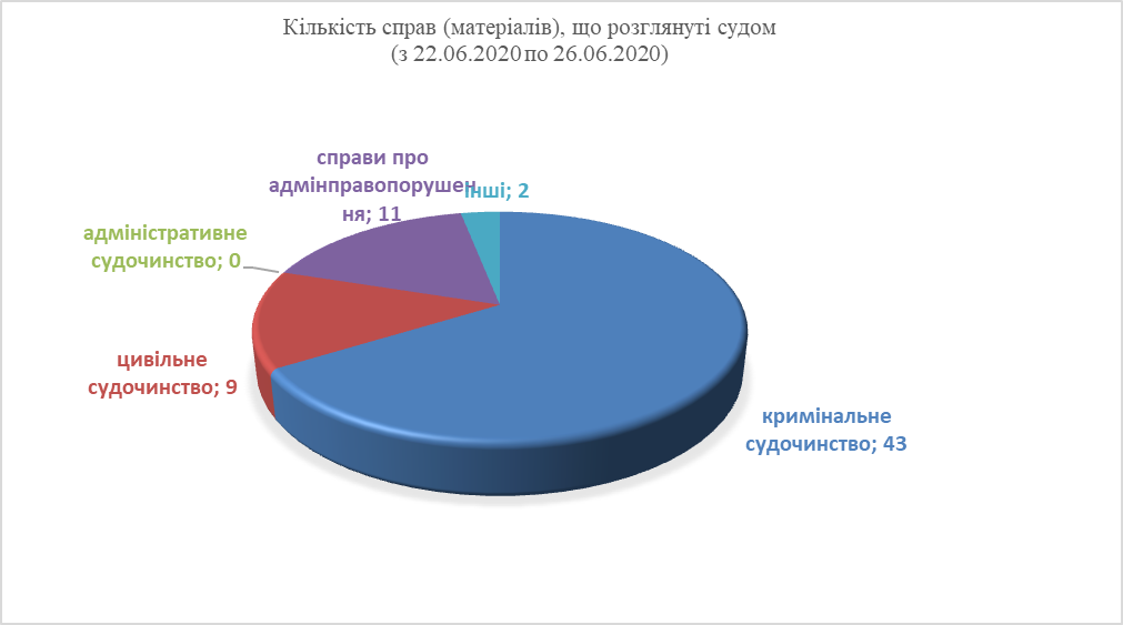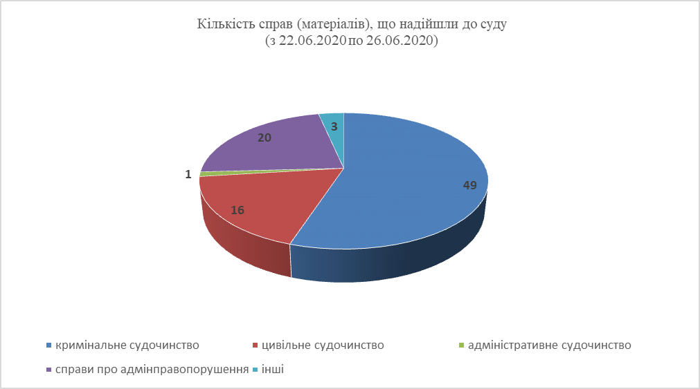 Так, у період з 22 червня 2020 року по 26 червня 2020 року до суду надійшло 89 справ (матеріалів) різних категорій.