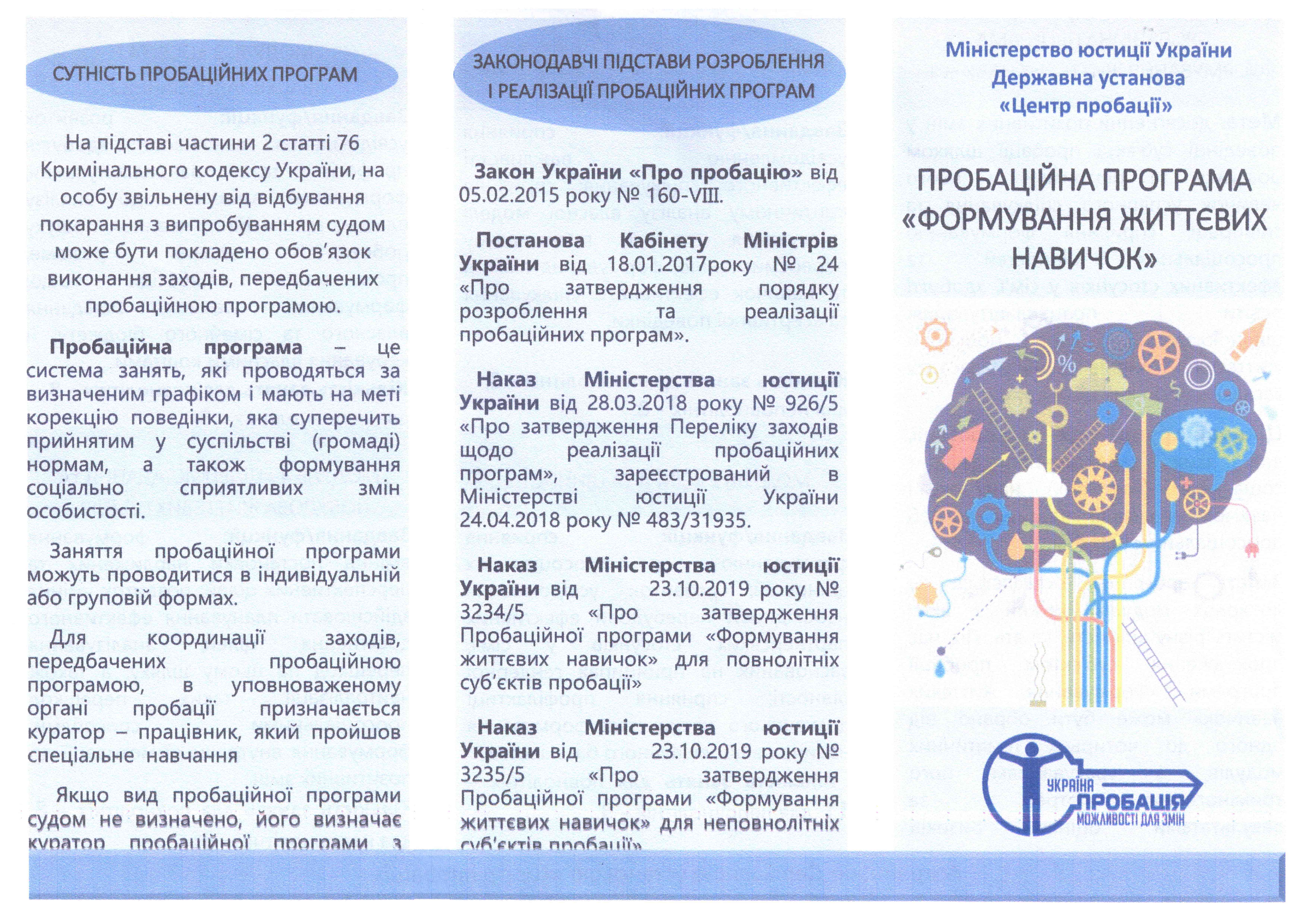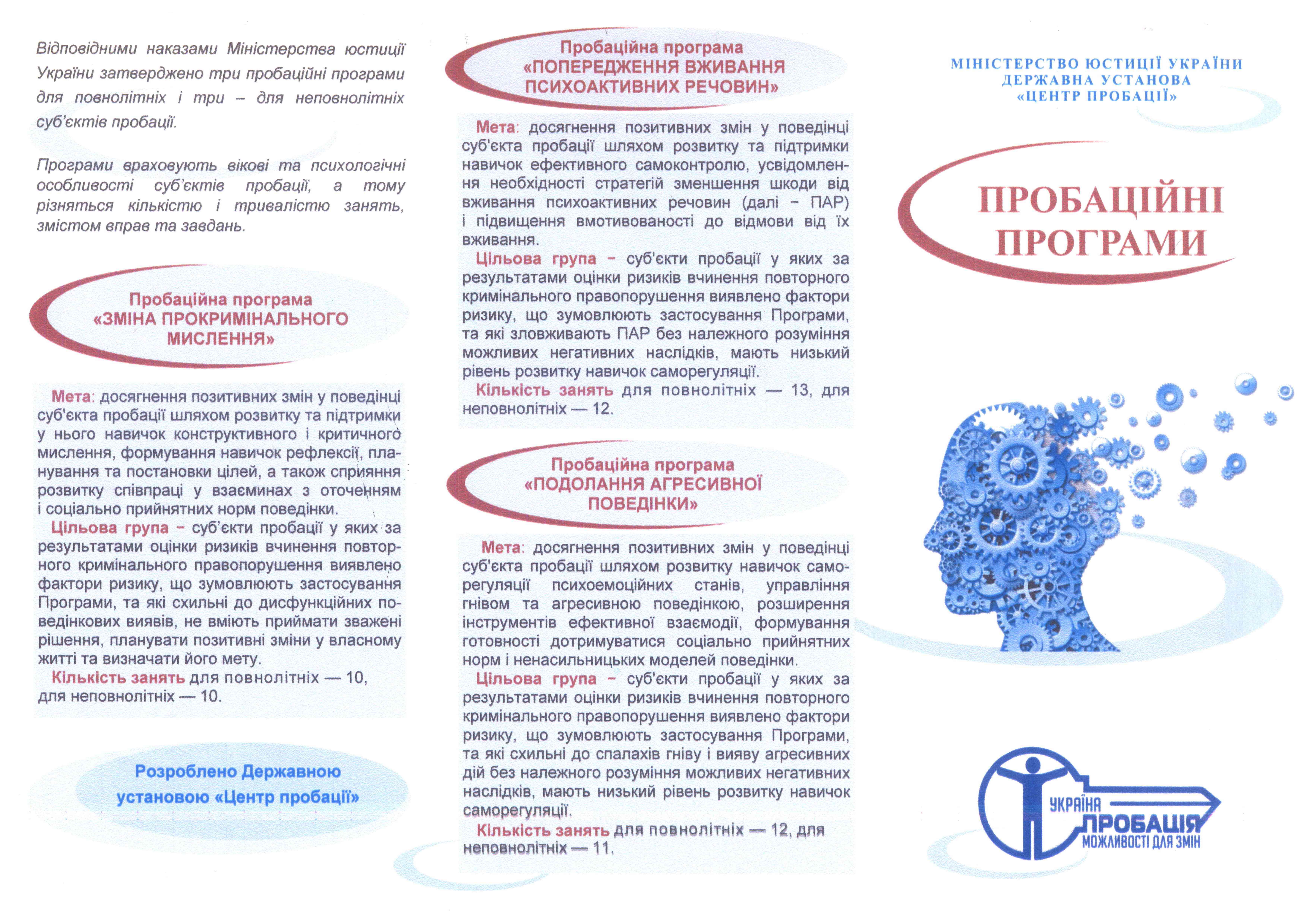 Відповідними наказами Міністерства юстиції України затверджено три пробаційні програми для повнолітніх і три – для неповнолітніх. Серед них: «Зміна прокримінального мислення», «Попередження вживання психотропних речовин», «Подолання агресивної поведінки», «Формування життєвих навичок». Детальніше за посиланням