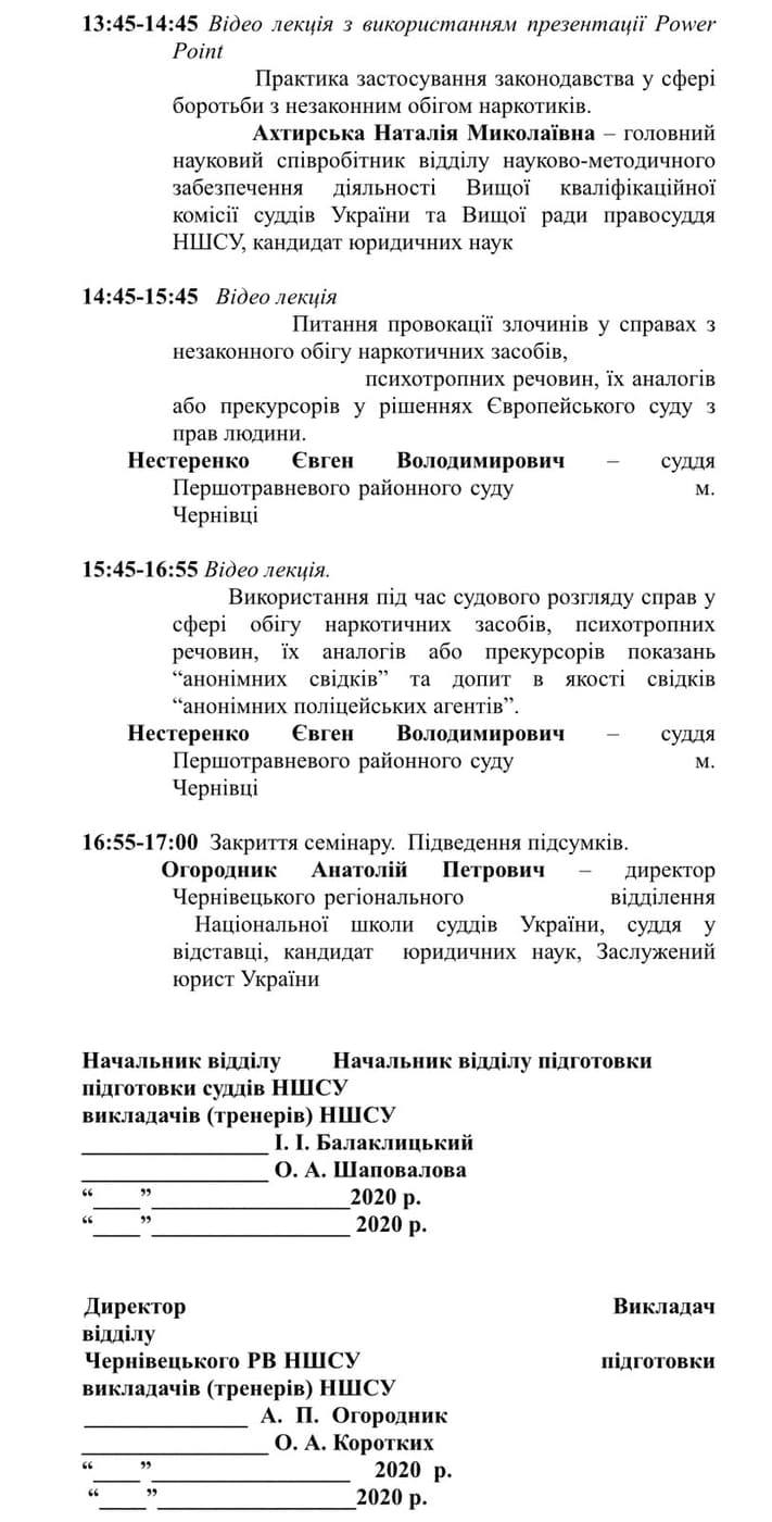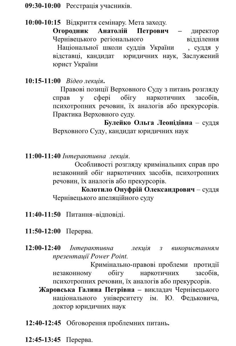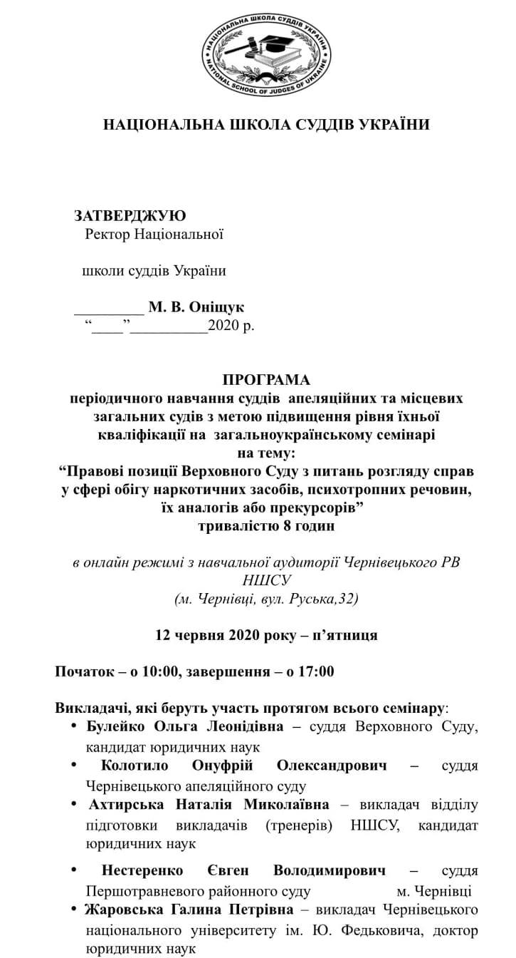 12 червня 2020 року Чернівецьким регіональним відділенням Національної школи суддів України проведено загальноукраїнський семінар для суддів апеляційних та місцевих судів з метою підвищення рівня їхньої кваліфікації на тему: «Правові позиції Верховного Суду з питань розгляду справ у сфері обігу наркотичних засобів, психотропних речовин, їх аналогів або прекурсорів».