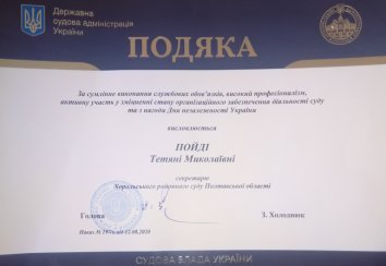За сумлінне виконання службових обов’язків, високий професіоналізм, активну участь у зміцненні стану організаційного забезпечення діяльності судів та з нагоди Дня незалежності України Подякою Державної судової адміністрації України відзначено секретаря Хорольського районного суду Полтавської області Пойду Тетяну Миколаївну.