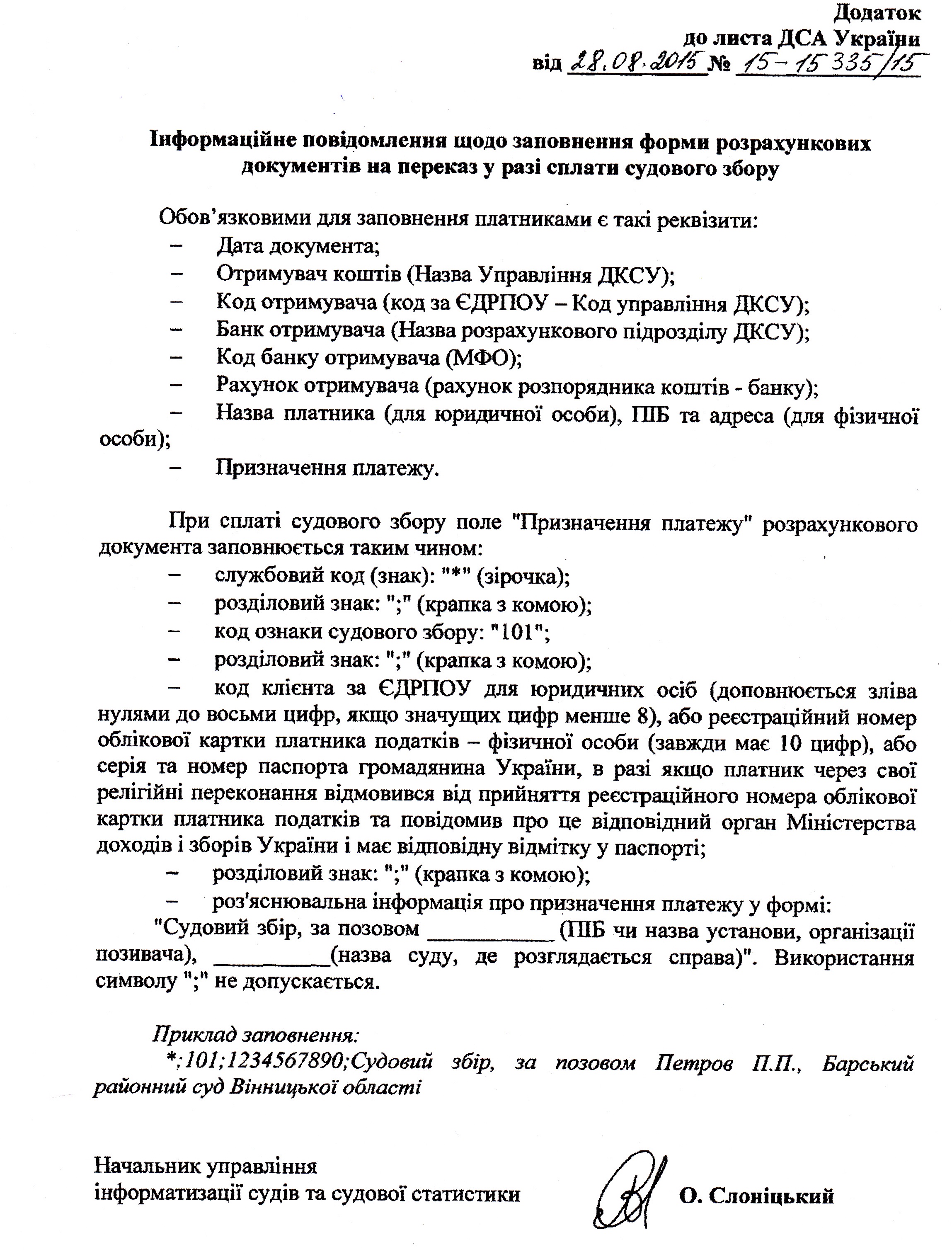 З метою встановлення єдиного порядку щодо заповнення реквізитів при сплаті судового збору через онлайн системи, банкомати для приймання платежів, Інтернет-банкінг, банківські установи тощо, обов’язковими для заповнення платниками є такі реквізити: