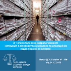 Державна судова адміністрація України оприлюднила Наказ № 1196 від 24.12.2019 "Про внесення змін до Інструкції з діловодства в місцевих та апеляційних судах України". Цим наказом затверджено зміни до Інструкції з діловодства в місцевих та апеляційних судах України, затвердженої наказом ДСА України від 20.08.2019 N 814, що додаються, які набирають чинності з 1 січня 2020 року.