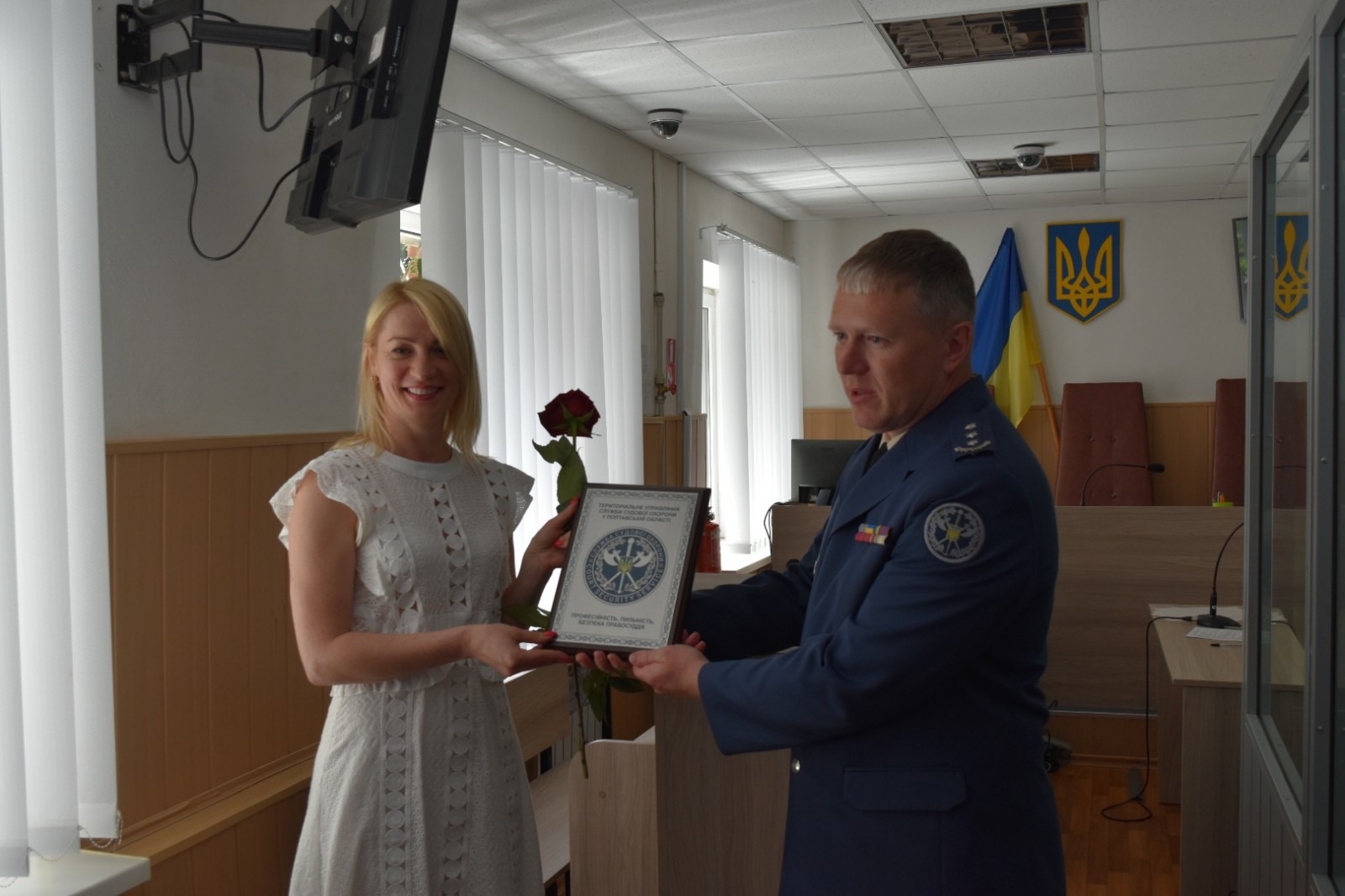Голові суду Олені Михайлюк начальник ТУ ССО у Полтавській області Олександр Аленін вручив символічний знак Служби та завірив у тому, що відтепер безпека у приміщенні цього суду буде на високому рівні.