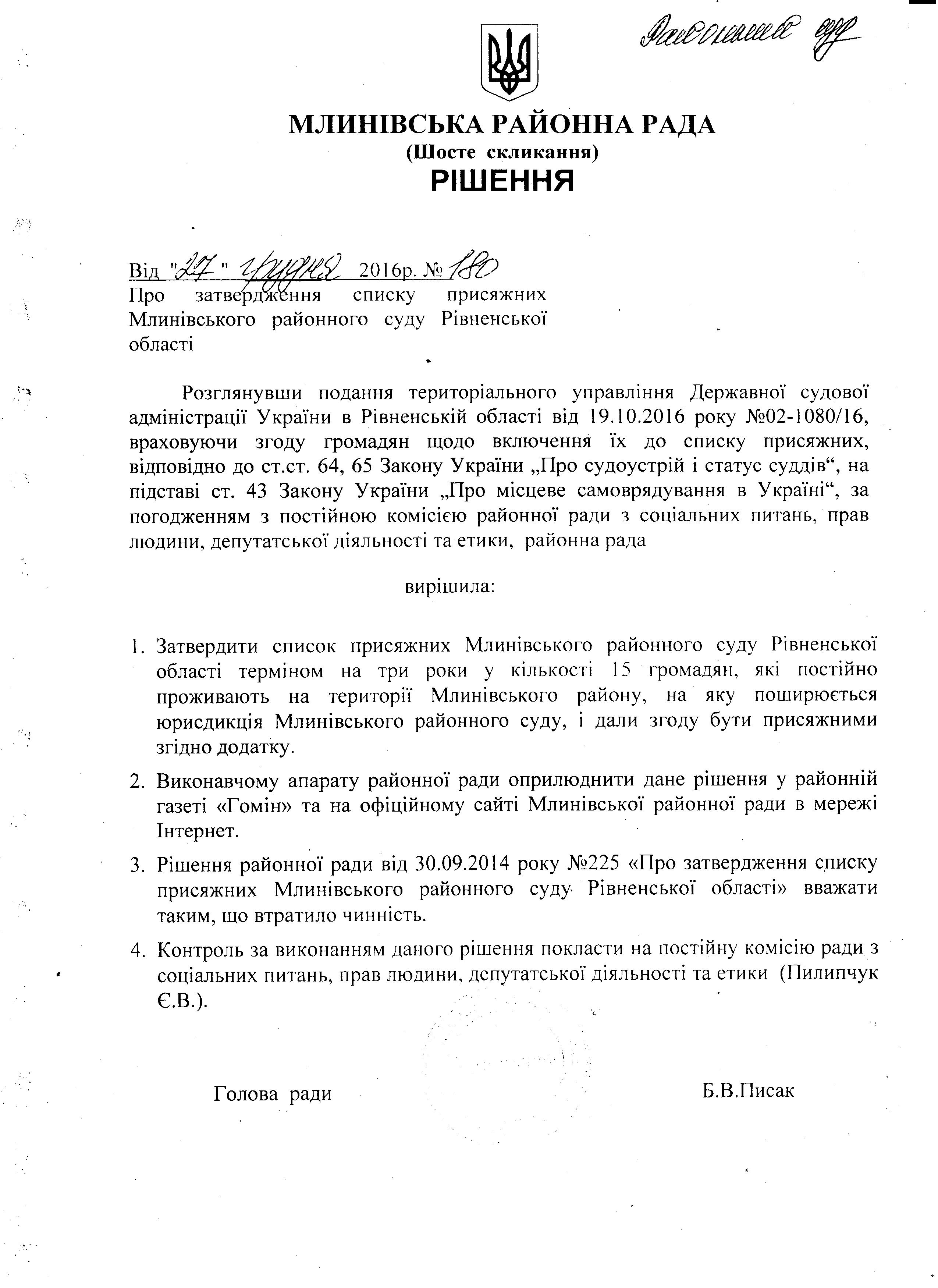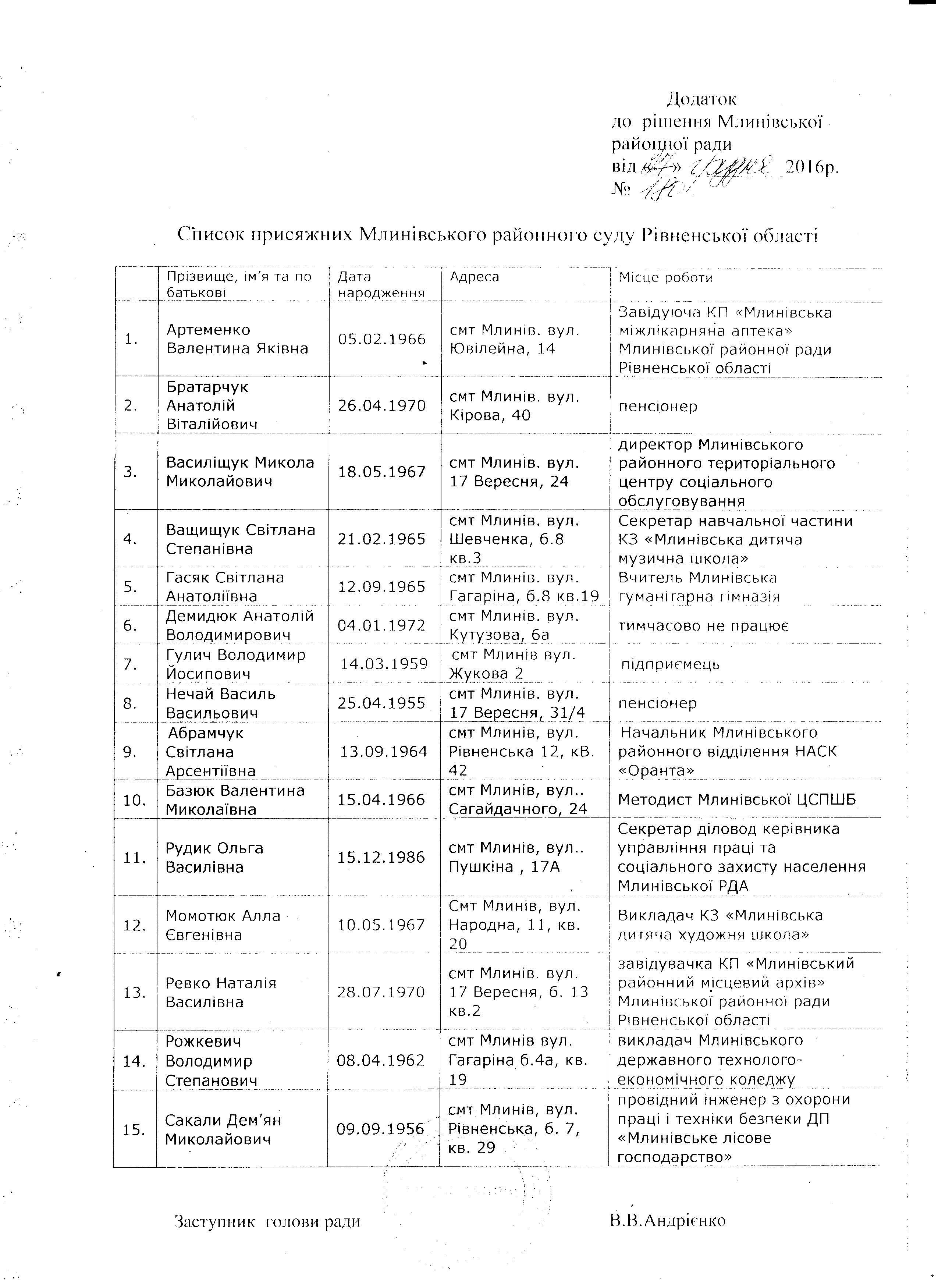 Рішенням Млинівської районної ради Рівненської області від 30 вересня 2014 року № 425 затверджено список присяжних Млинівського районного суду Рівненської області в кількості 15 осіб: