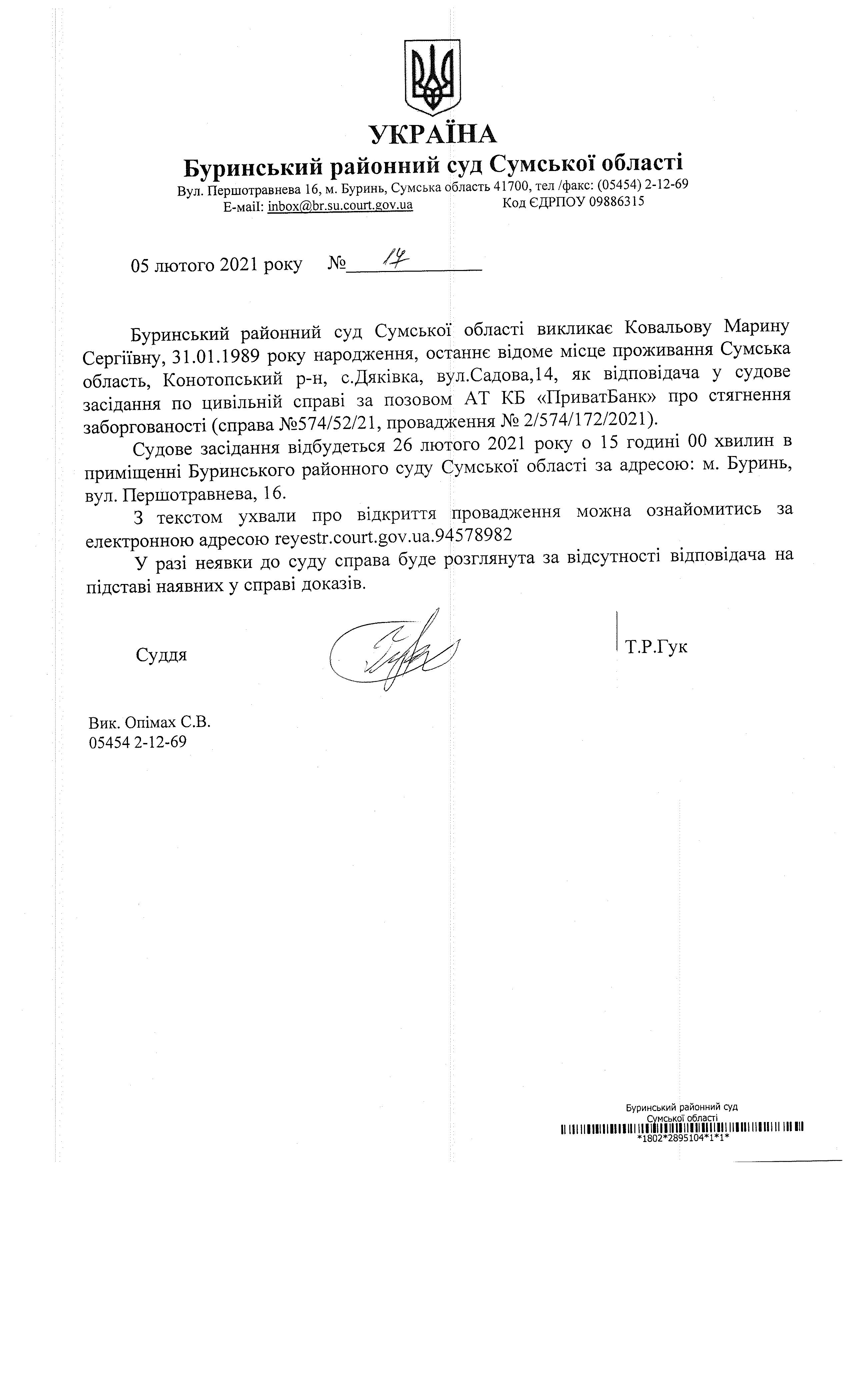 Оголошення про виклик Ковальову Марину Сергіївну