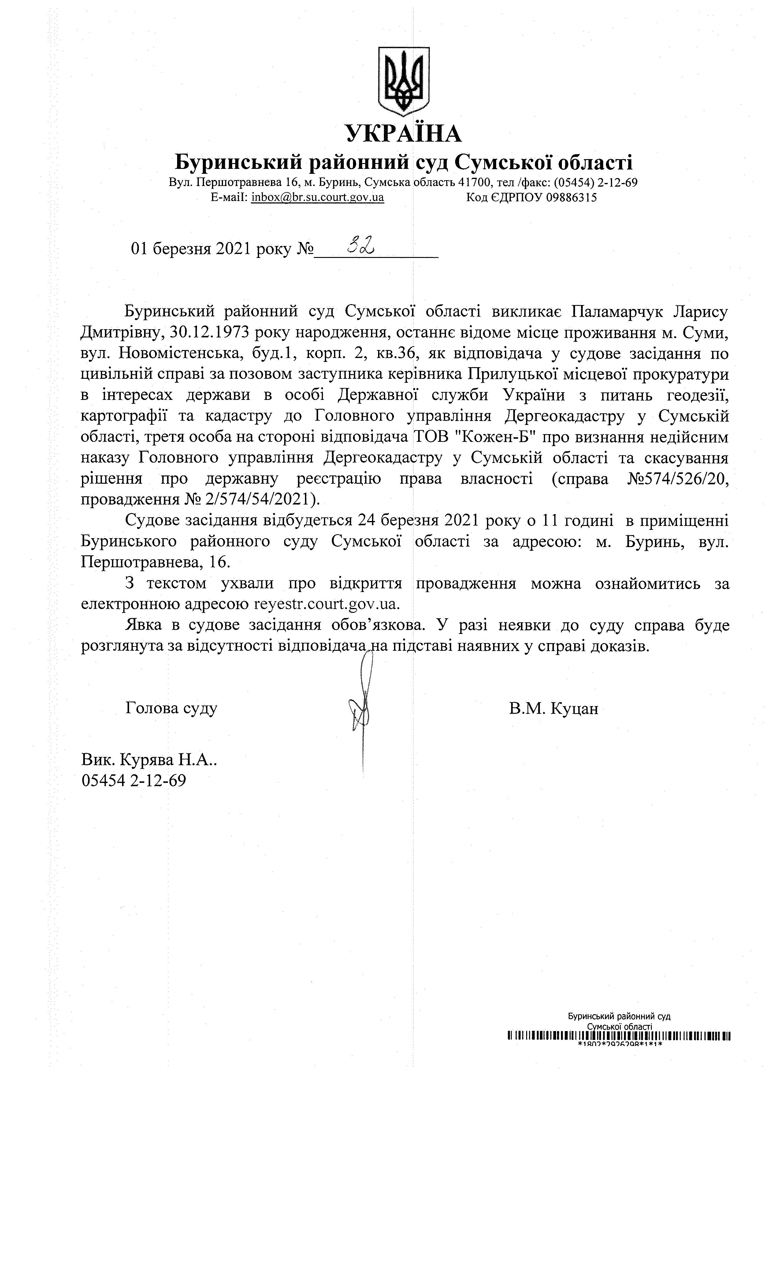 Буринський районний суд Сумської області викликає Паламарчук Ларису Дмитрівну