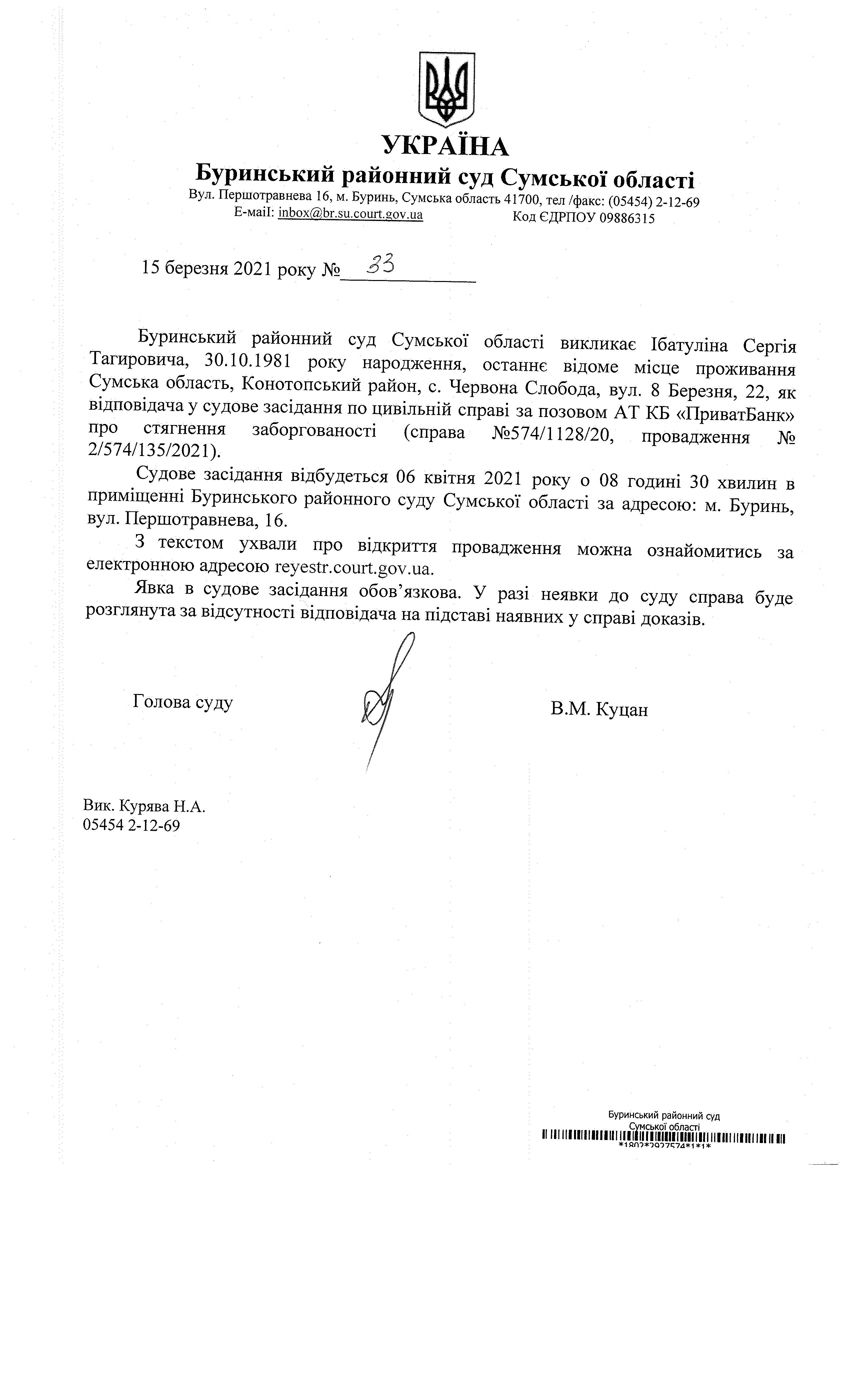 Буринський районний суд Сумської області викликає Ібатуліна Сергія Тагировича