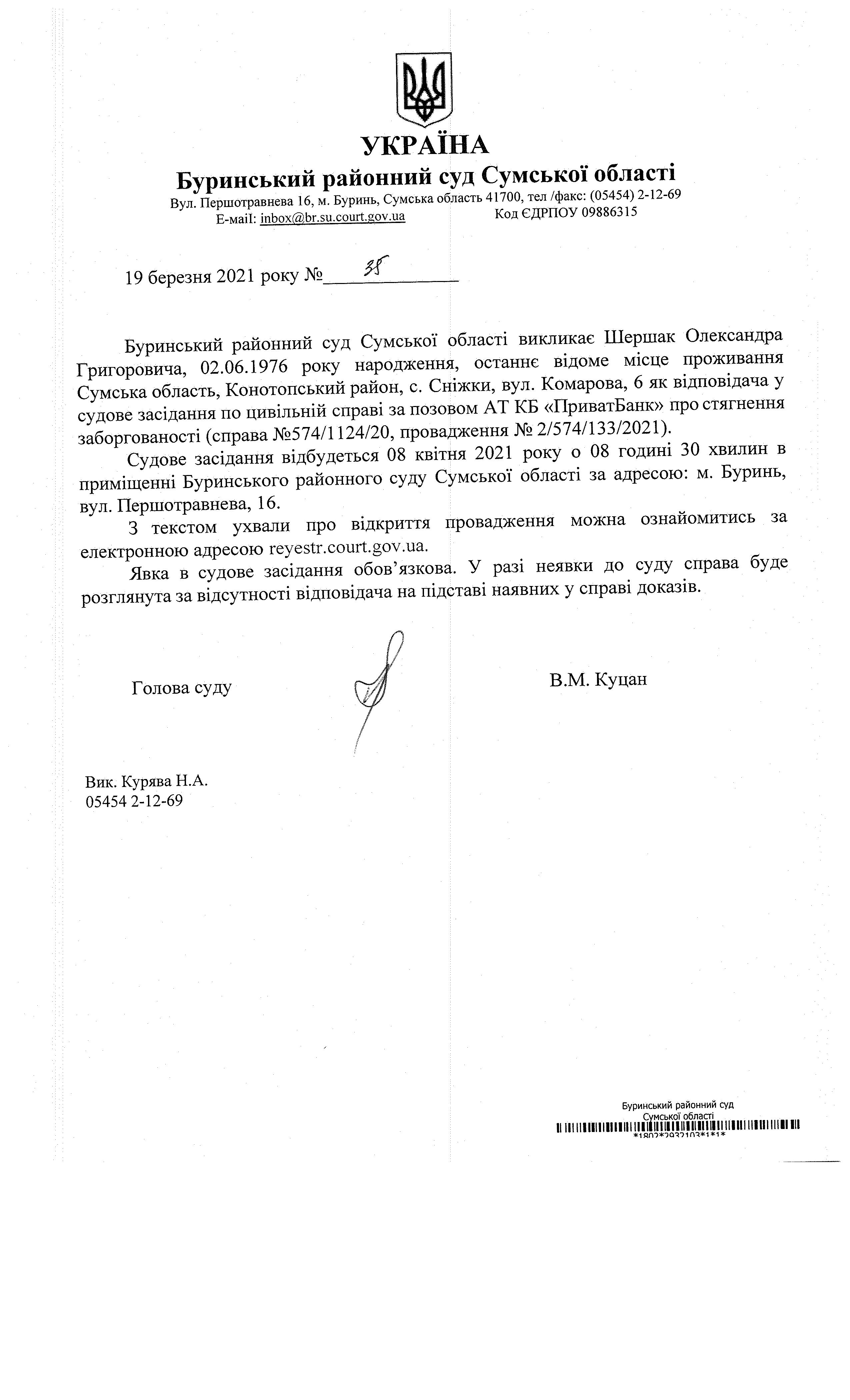 Буринський районний суд Сумської області викликає Шершак Олександра Григоровича