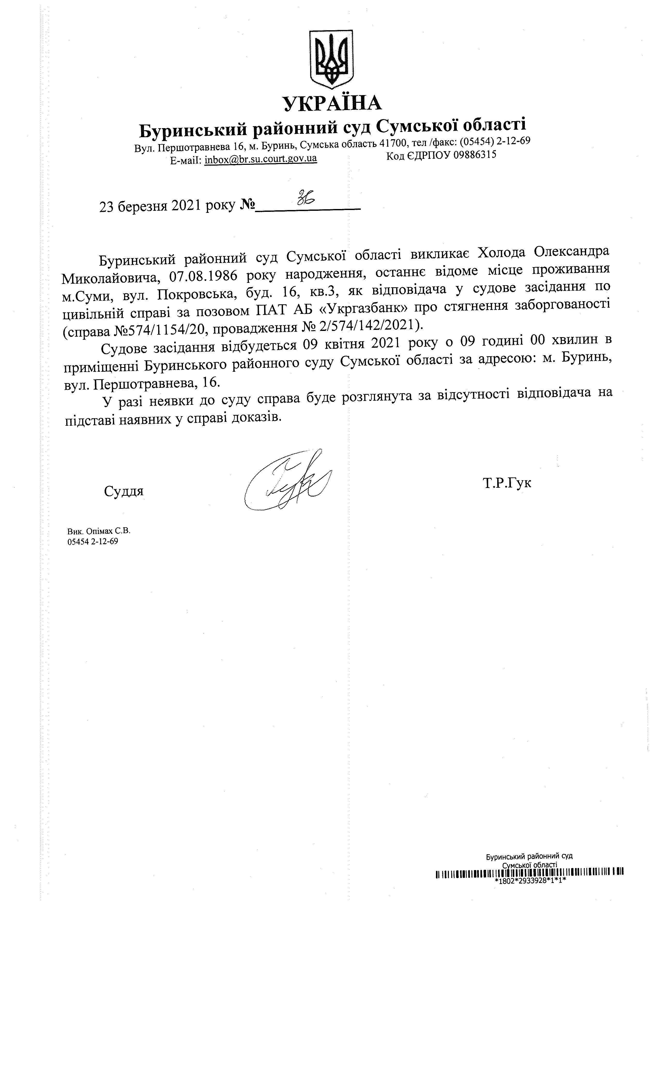 Буринський районний суд Сумської області викликає Холода Олександра Миколайовича