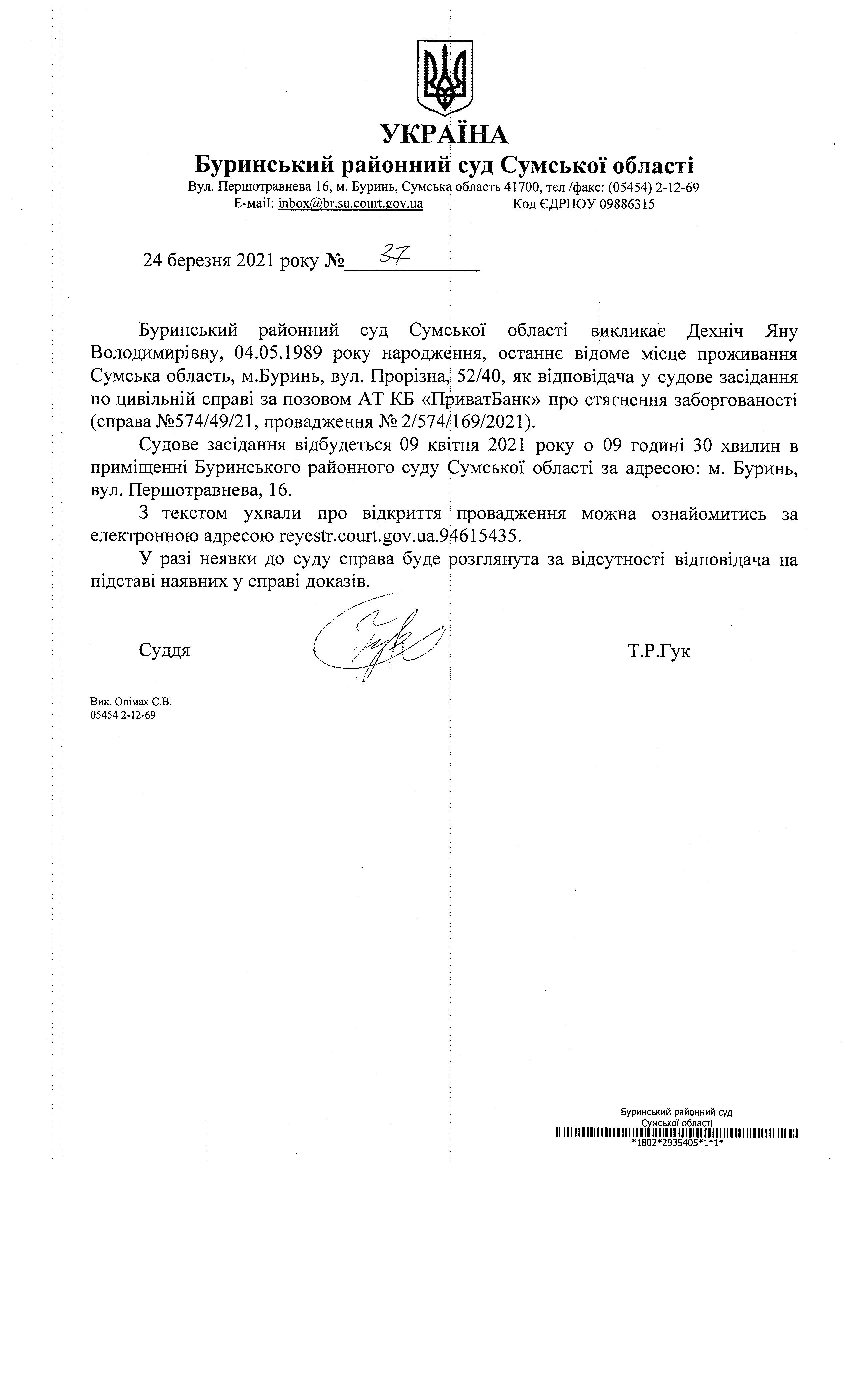Буринський районний суд Сумської області викликає Дехніч Яну Володимирівну