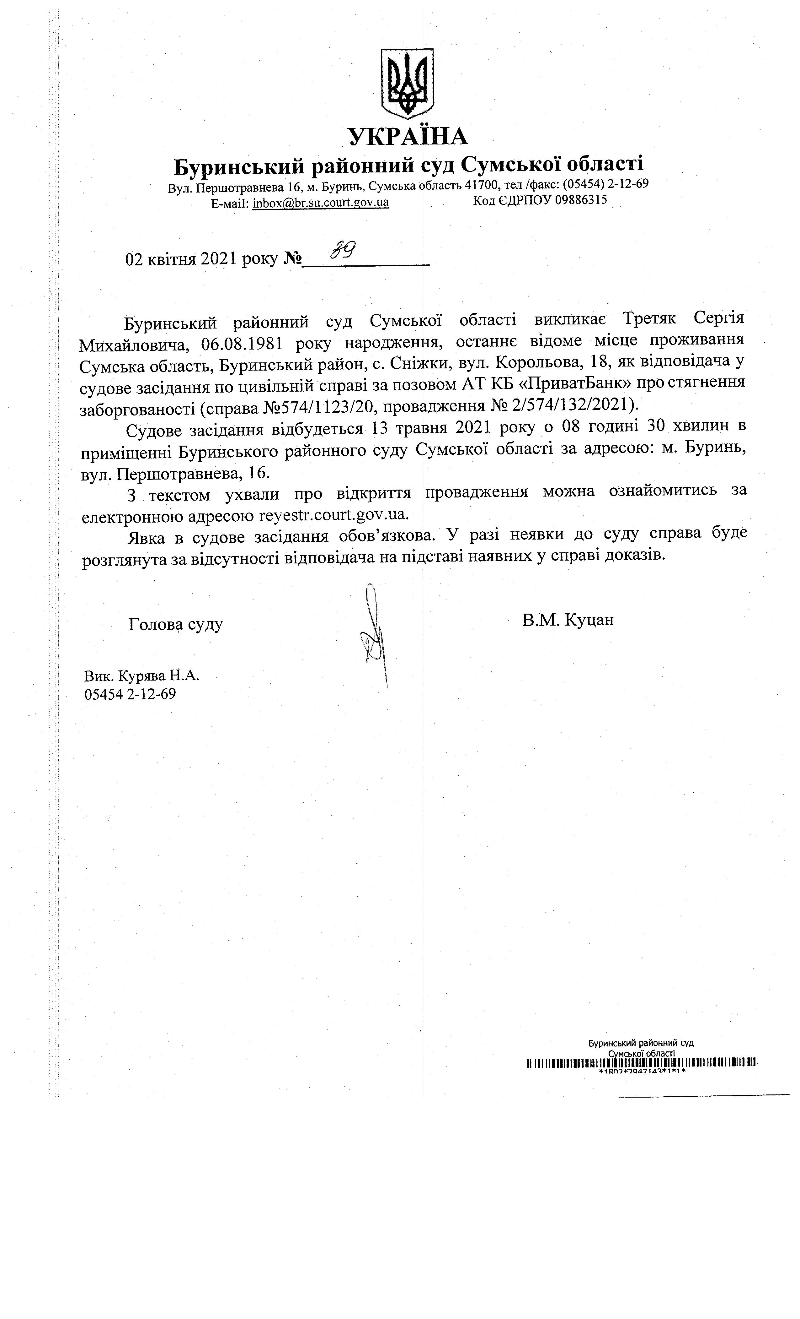 Оголошення про виклик Третяк Сергія Михайловича