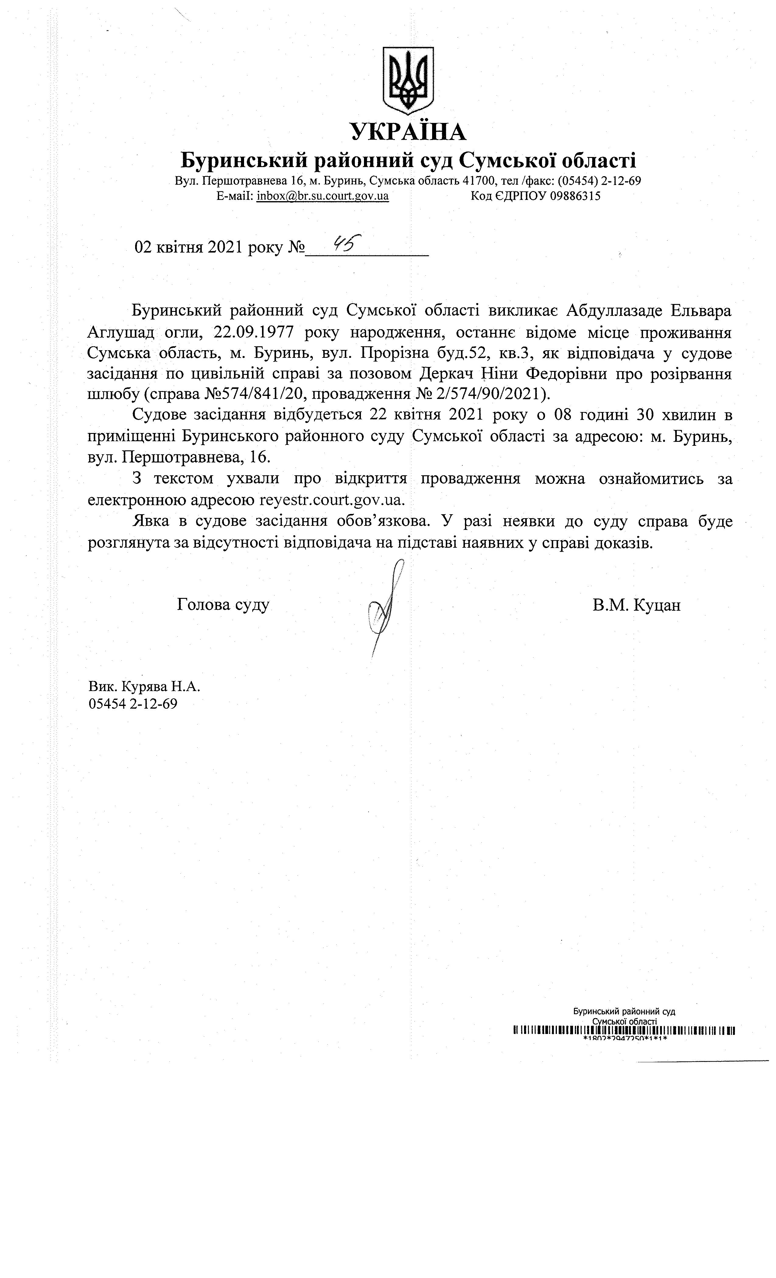 Оголошення про виклик Абдуллазаде Ельвара Аглушад