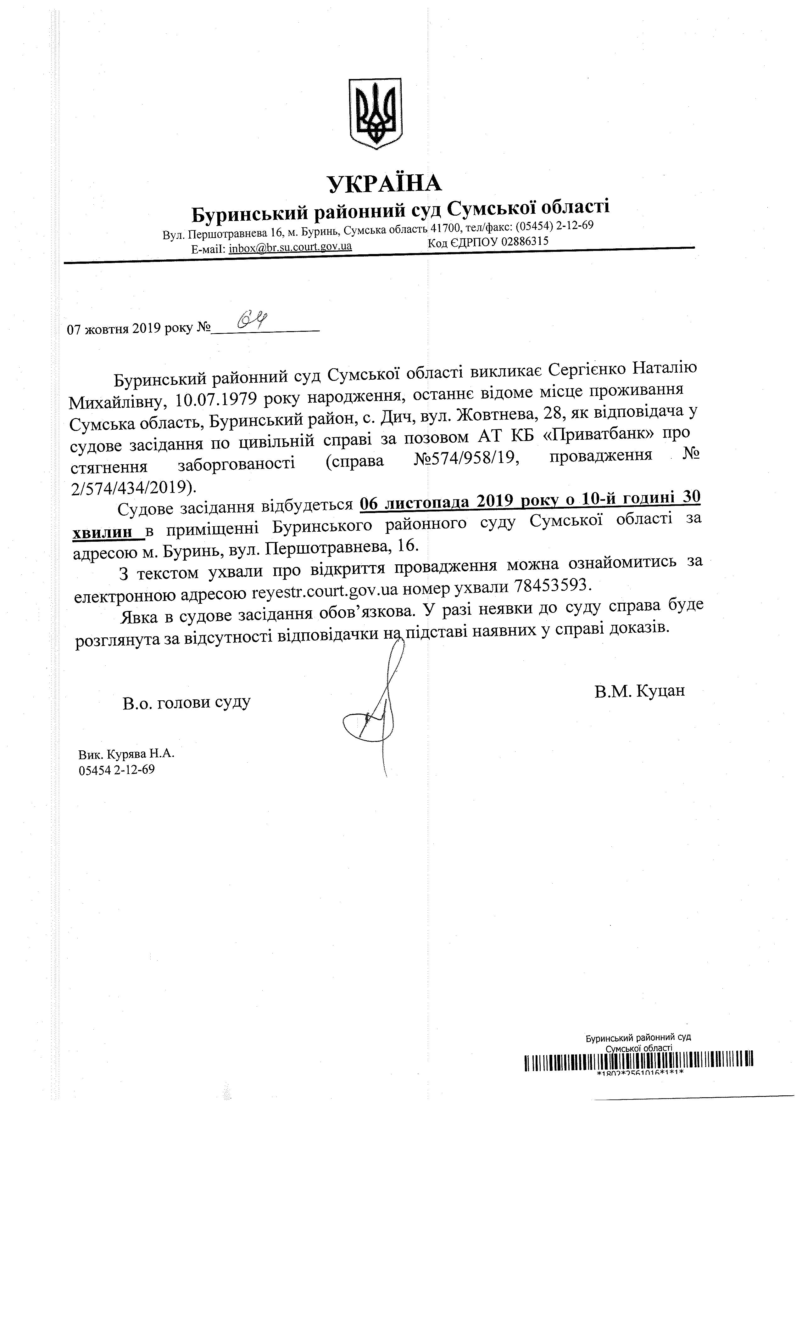 Оголошення про виклик Сергієнко Наталію Михайлівну