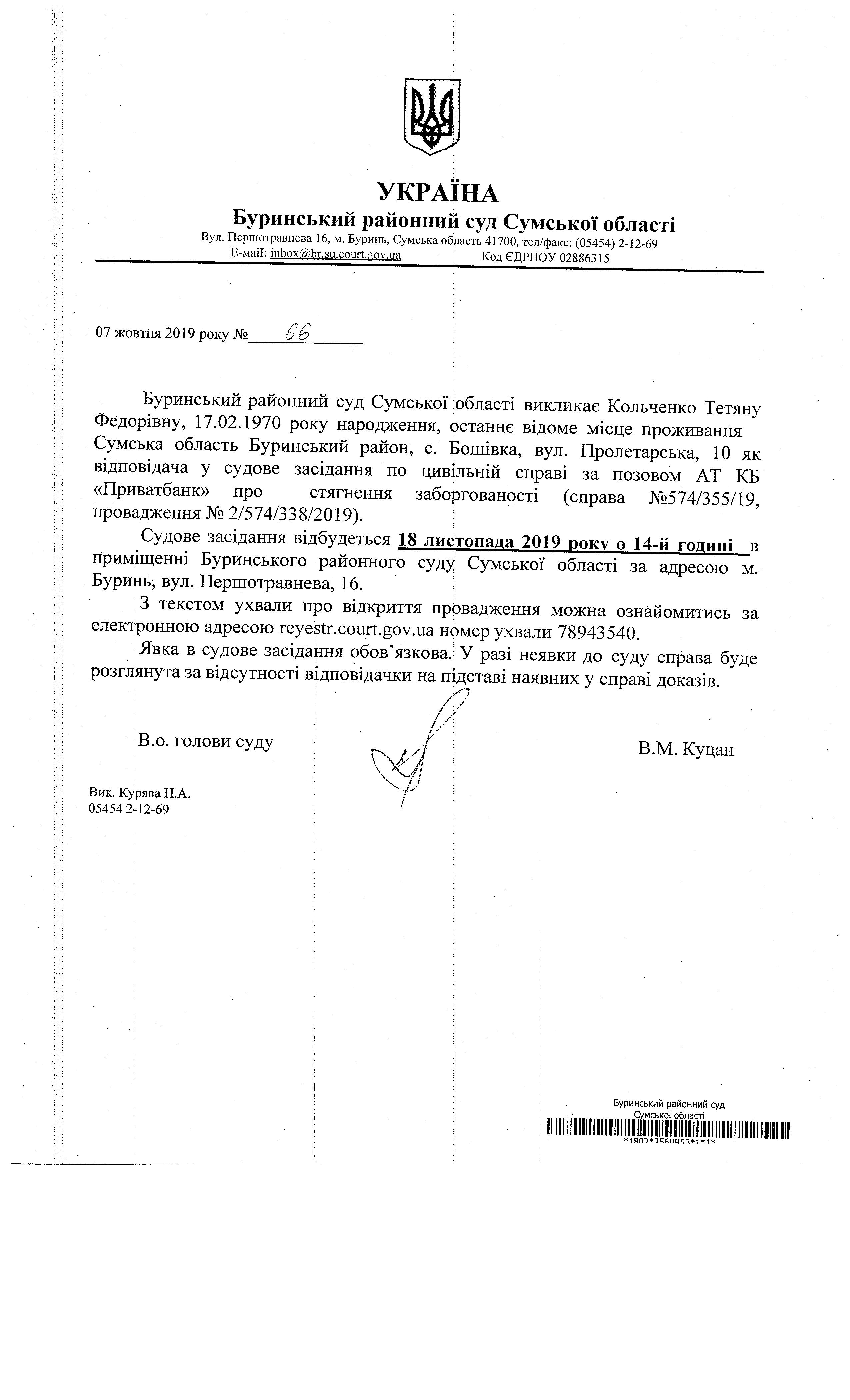 Оголошення про виклик Кольченко Тетяну Федорівну