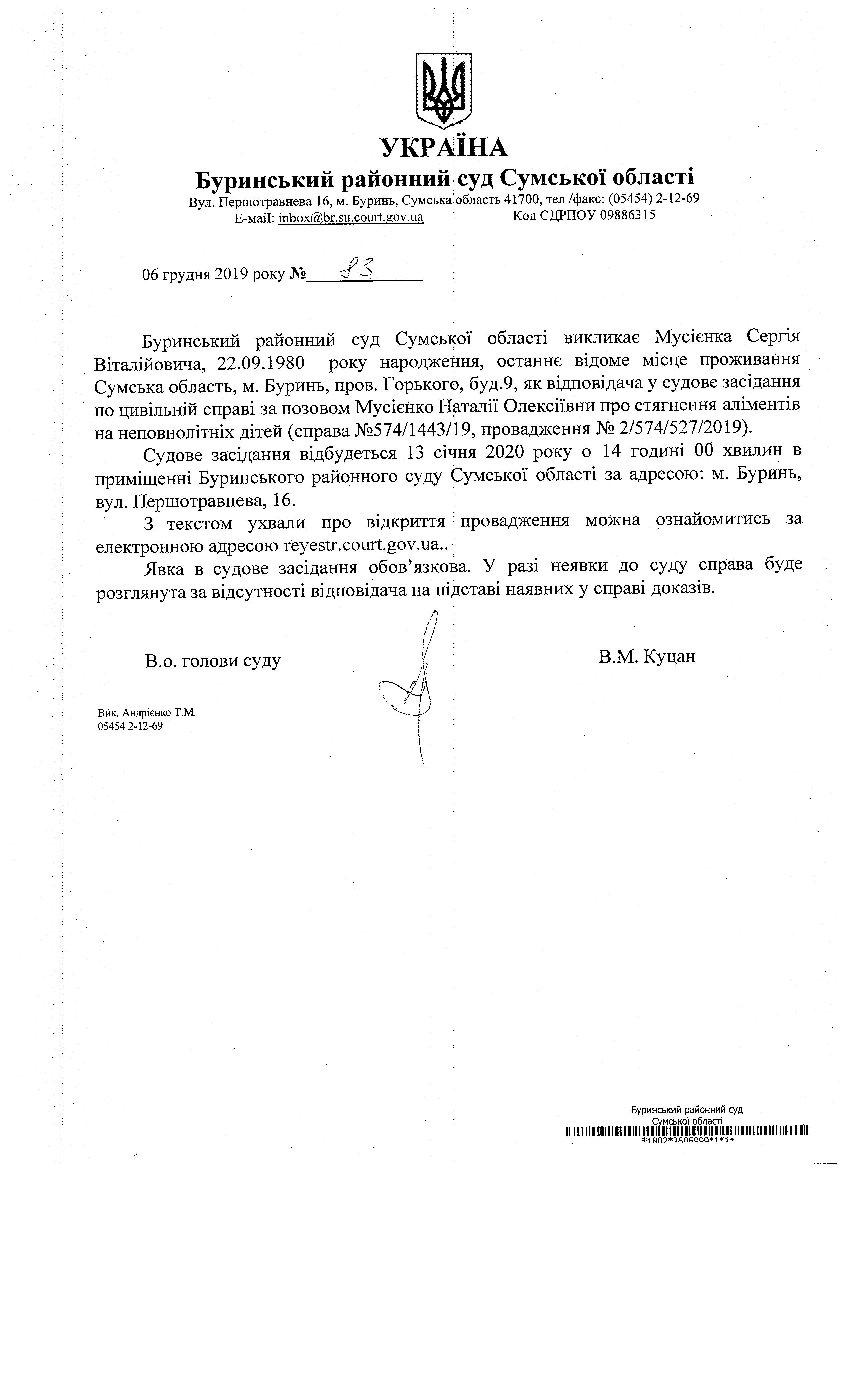 Оголошення про виклик Мусієнка Сергія Віталійовича