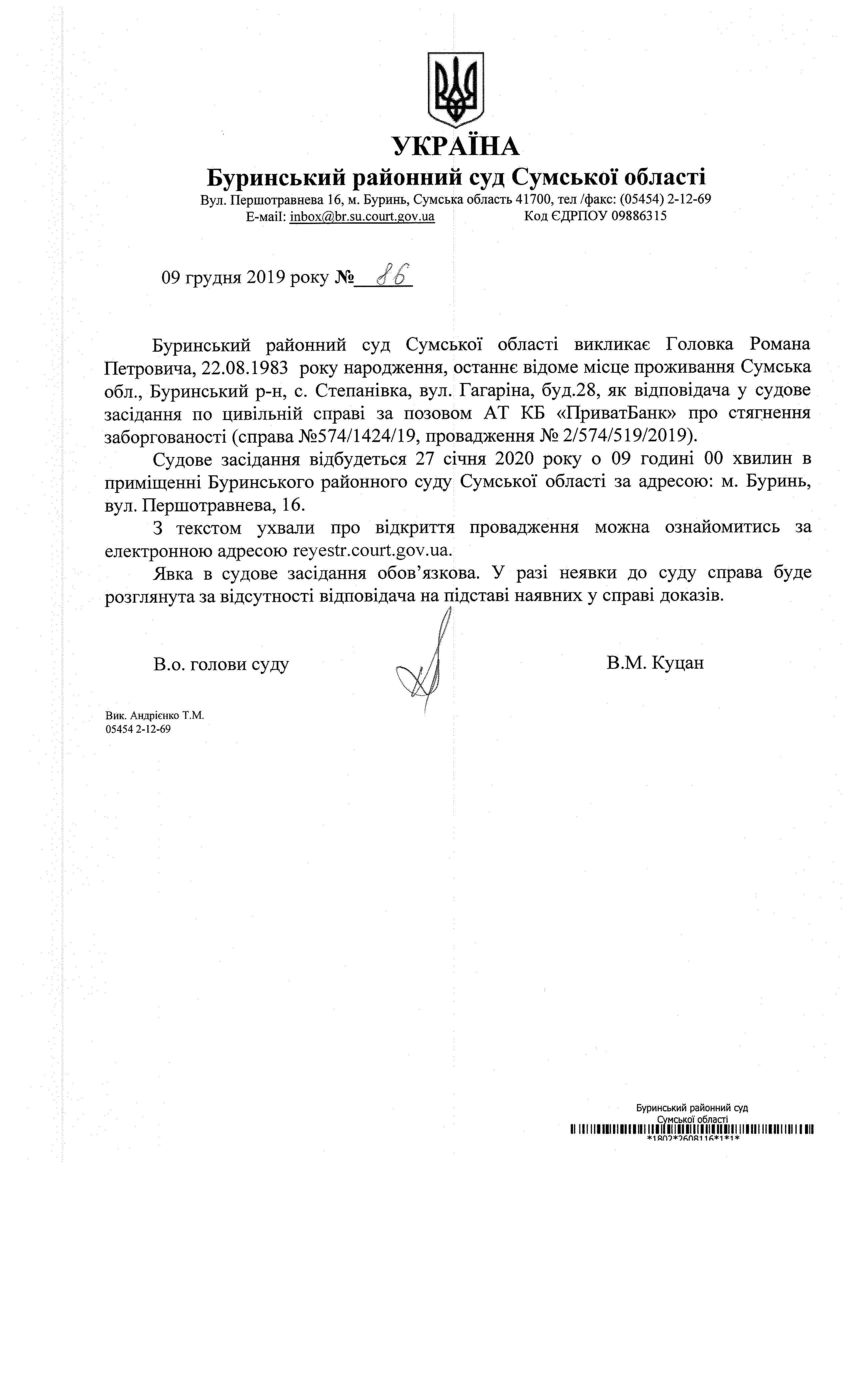 Оголошення про виклик Головка Романа Петровича