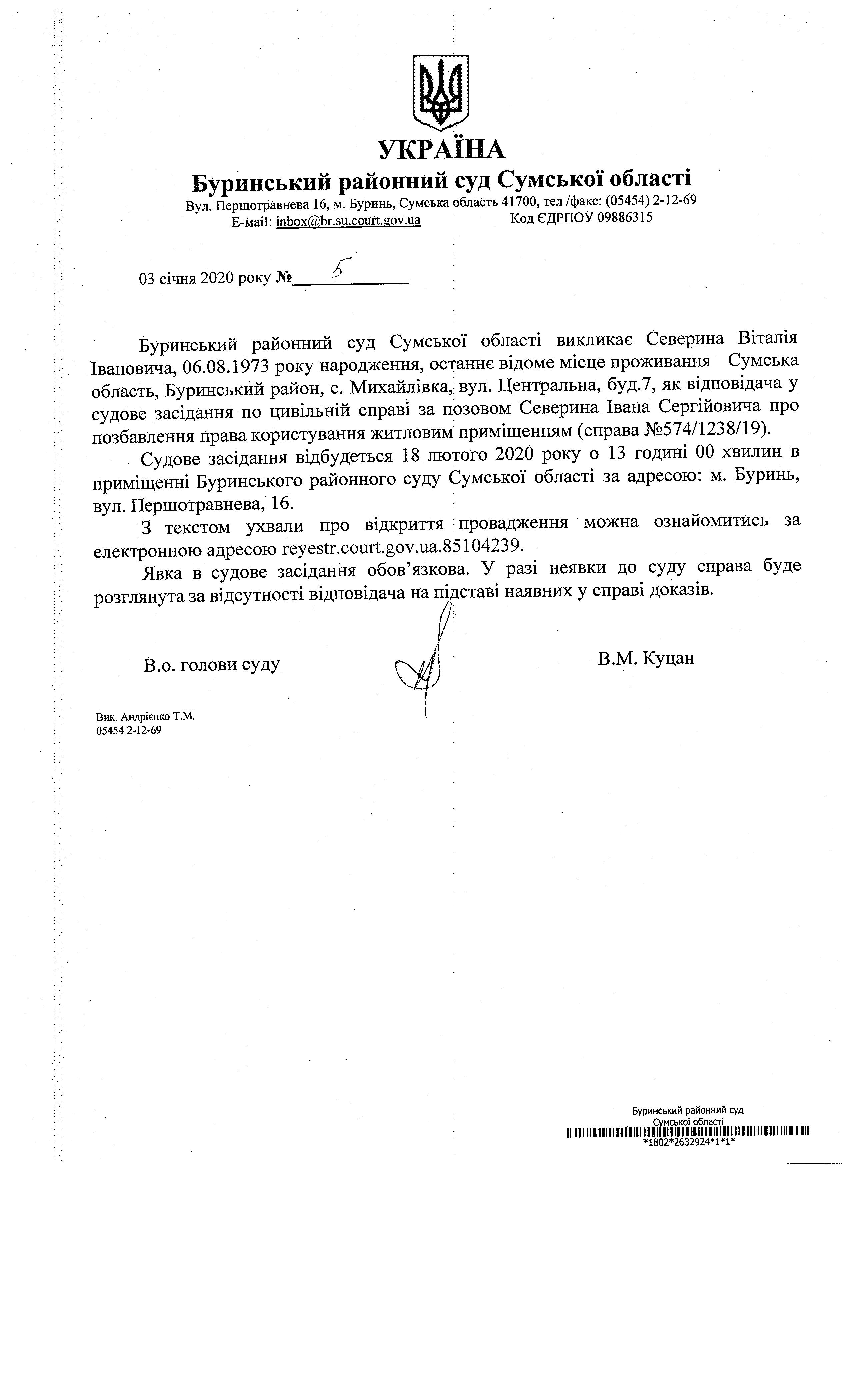 Оголошення про виклик Северина Віталія Івановича