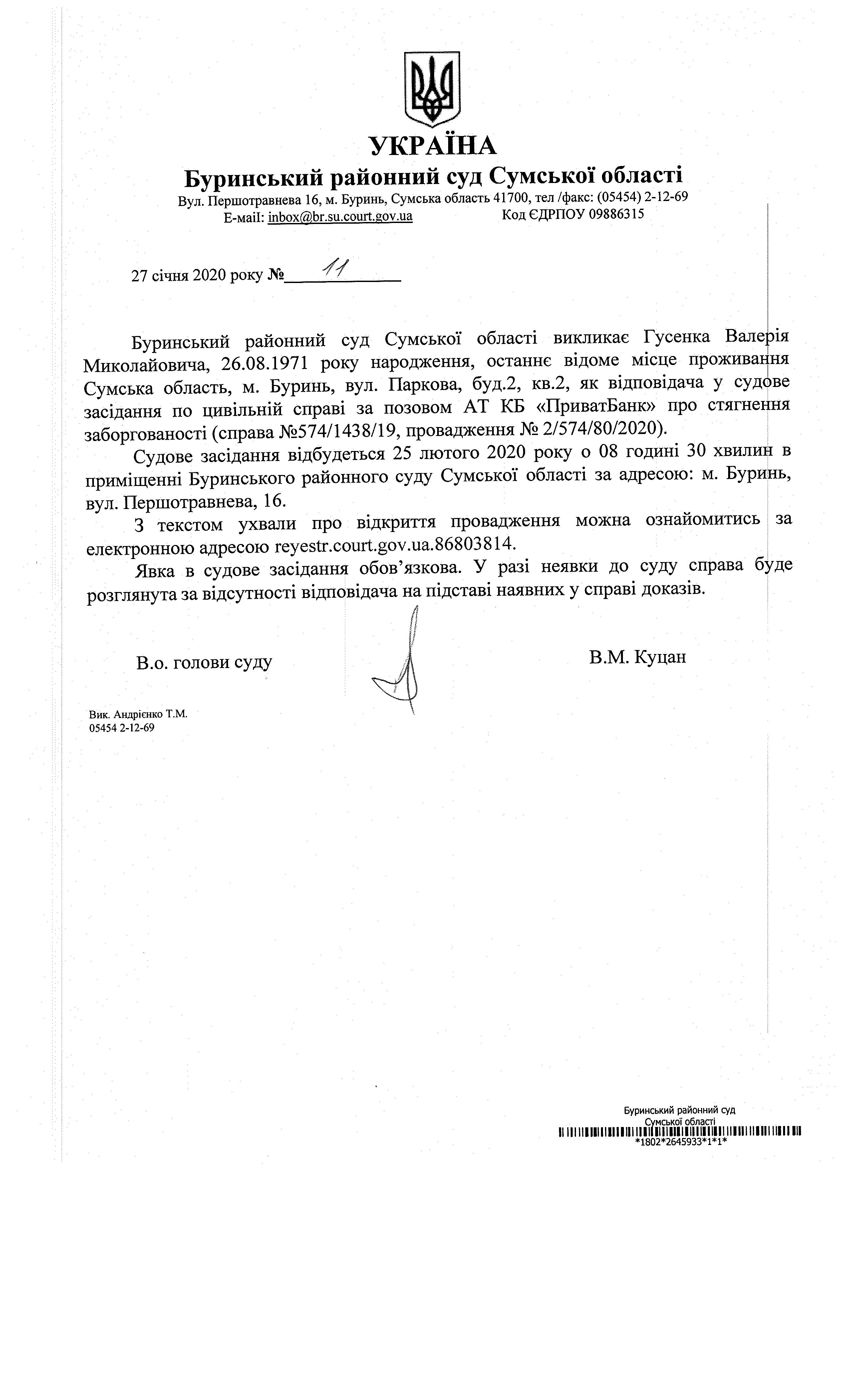 Оголошення про виклик Гусенка Валерія Миколайовича