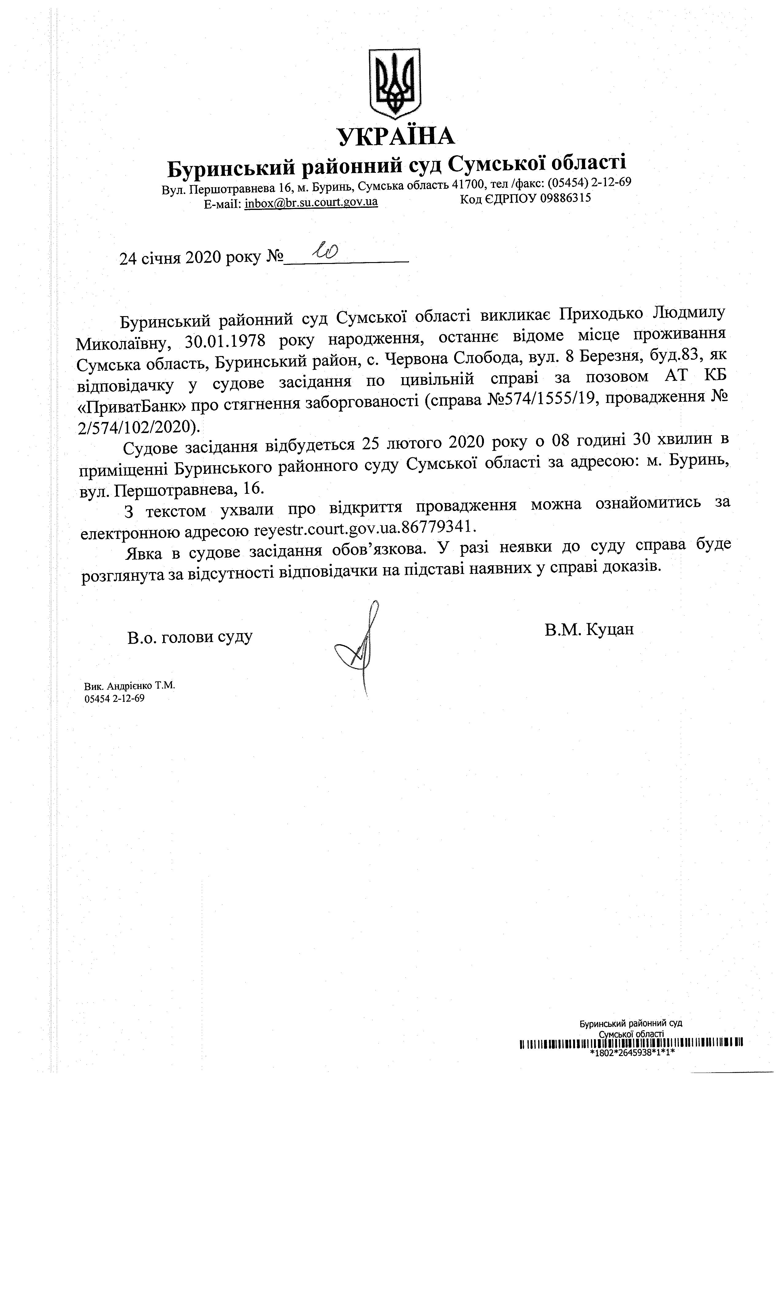 Оголошення про виклик Приходько Людмилу Миколаївну