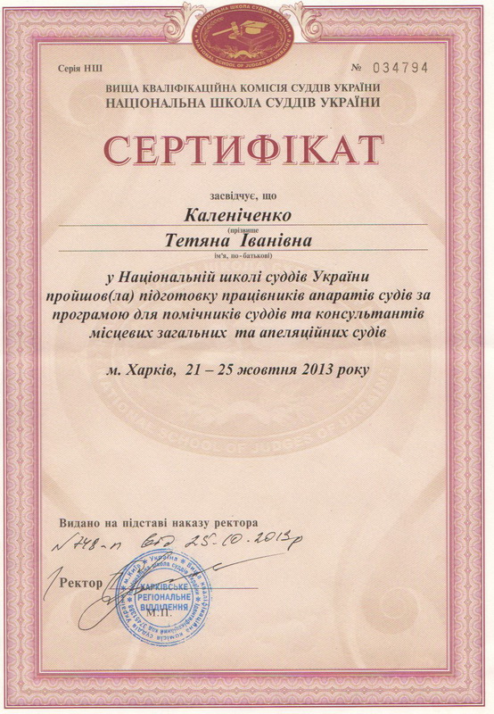 З 21 по 25 жовтня 2013 року помічник судді Зарічного районного суду м. Суми Каленіченко Тетяна Іванівна у Харківському регіональному відділенні Національної школи суддів України пройшла підготовку працівників апаратів судів за програмою для помічників суддів та консультантів місцевих та апеляційних судів загальної юрисдикції.