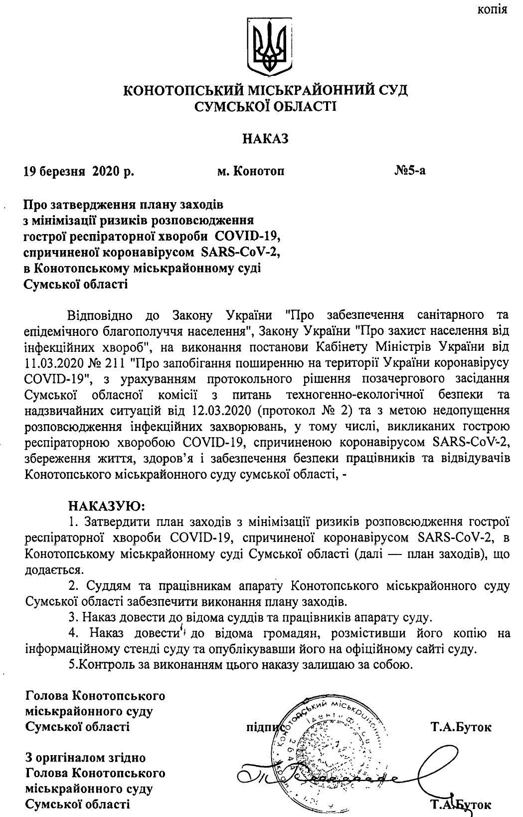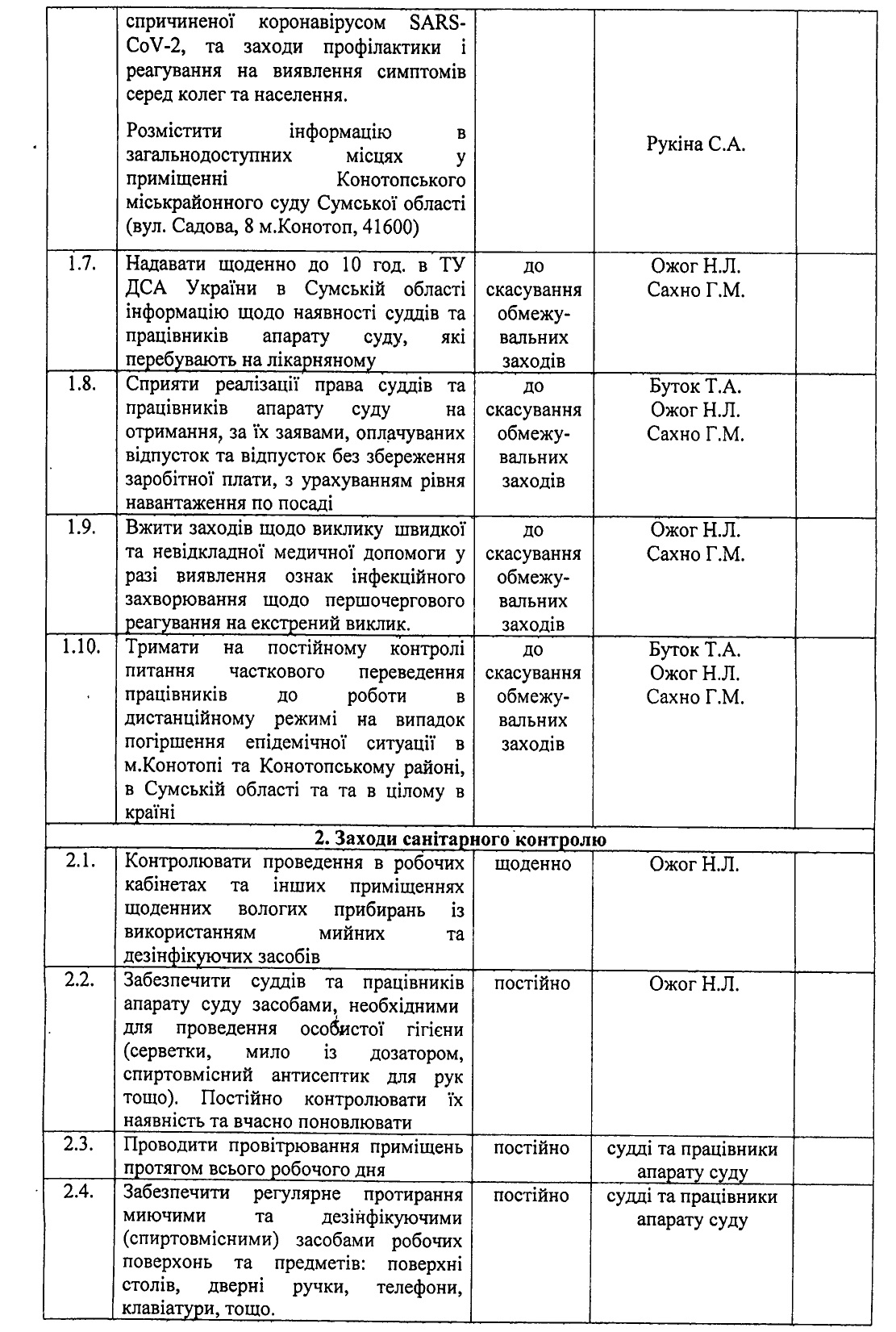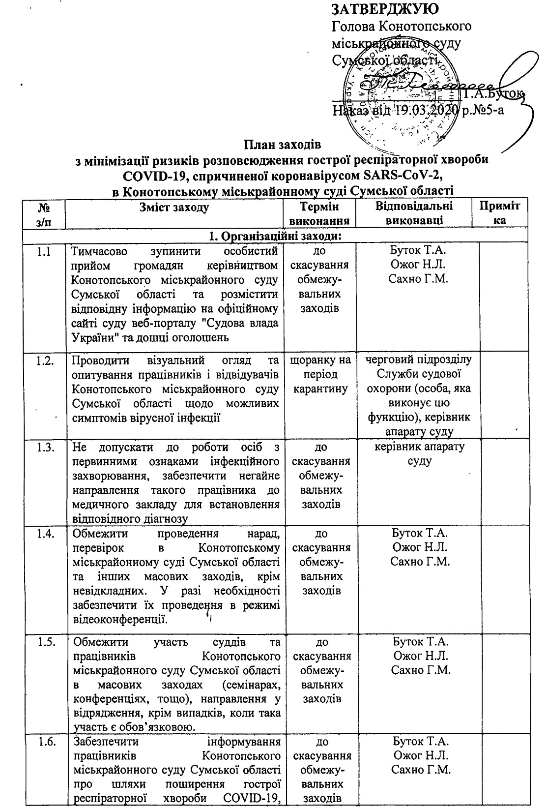 План заходів з мінімізації ризиків розповсюдження гострої респіраторної хвороби COVID-19, спричиненої коронавірусом SARS-CoV-2, в Конотопському міськрайонному суді Сумської області