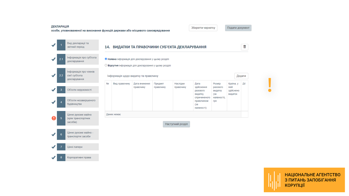 Розділ 14 «Видатки та правочини суб’єкта декларування» декларації — оновлений блок