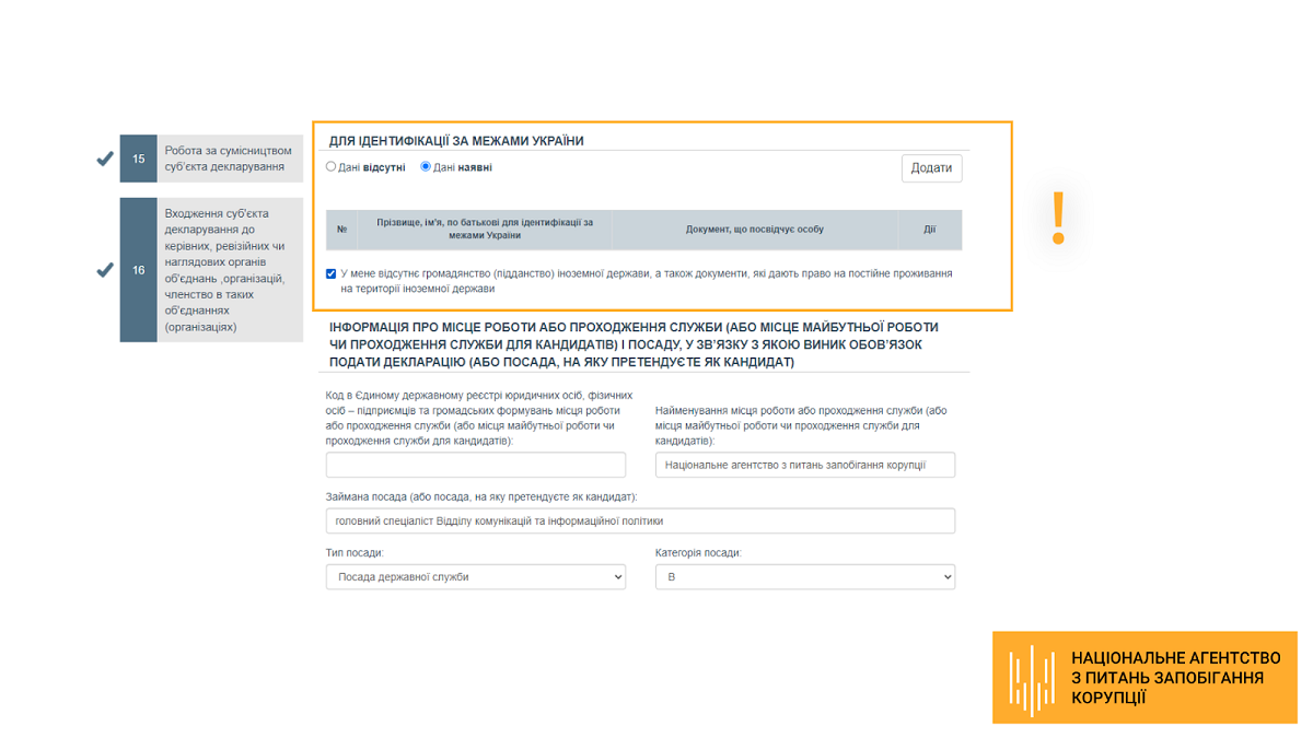 Розділи 2.1 «Інформація про суб’єкта декларування» декларації — нові позначки