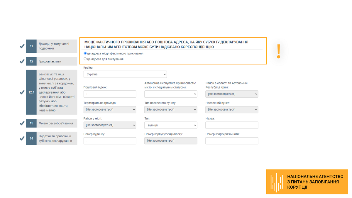У блоці «Місце фактичного проживання або поштова адреса, на яку суб’єкту декларування Національним агентством може бути надіслано кореспонденцію» додано дві позначки — «це адреса місця фактичного проживання» та «це адреса для листування».