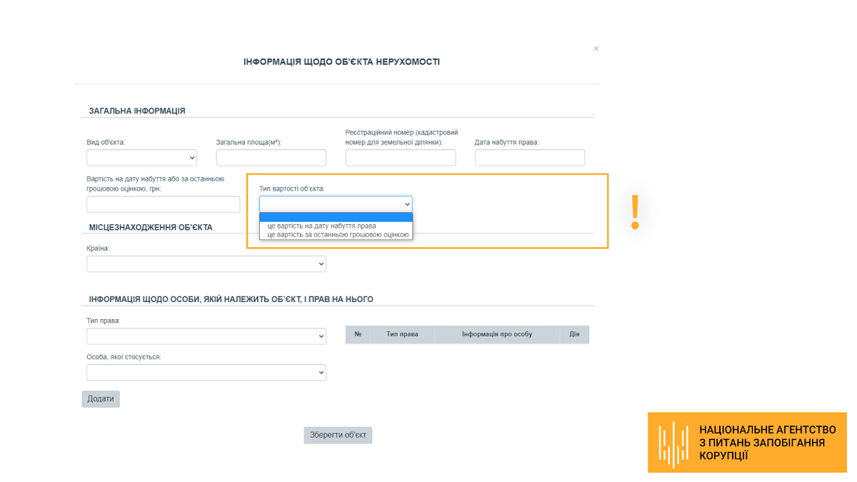Розділи 3 «Об’єкти нерухомості», 5 «Цінне рухоме майно (крім транспортних засобів)», 6 «Цінне рухоме майно — транспортні засоби», 10 «Нематеріальні активи» — поле «Тип вартості майна»