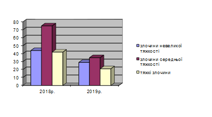 Окрім того, слід зазначити, що як протягом 2019 року, так і протягом 2018 року не вчинялися злочини: у сфері господарської діяльності, проти безпеки виробництва, у сфері використання електрообчислювальних машин, систем та комп’ютерних мереж і мереж електрозв’язку, у сфері охорони державної таємниці, недоторканості державних кордонів, забезпечення призову та мобілізації, проти основ національної безпеки України.